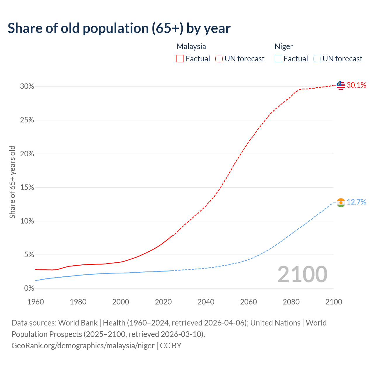 The share of older people aged 65 and over is 7.74% in Malaysia and 2.59% in Niger. Life expectancy in Malaysia compared to Niger .