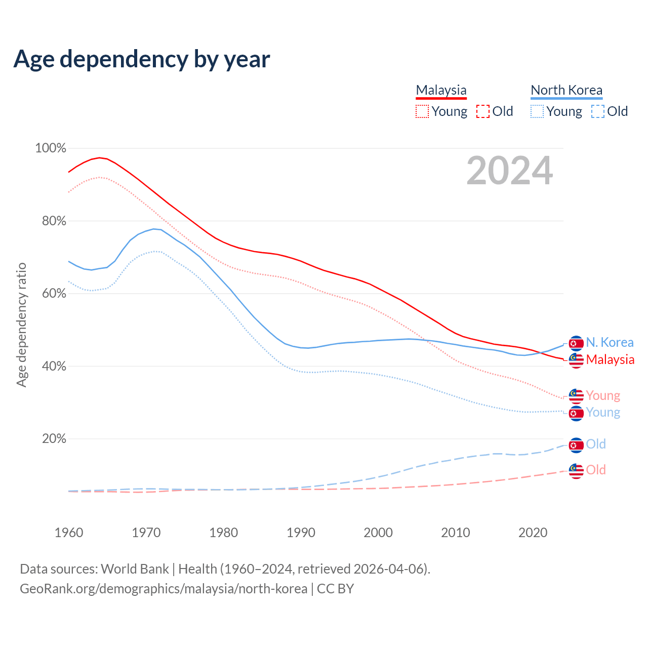 - Malaysia is ranked 92/196 by median age (oldest to youngest) vs 62/196 for North Korea.