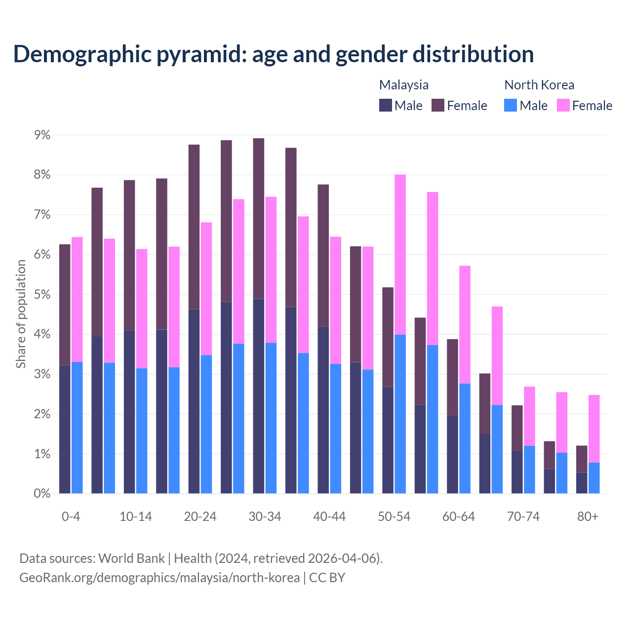 - As of 2026, the population of Malaysia is 36.5M vs 26.7M in North Korea - 1.37 times difference.