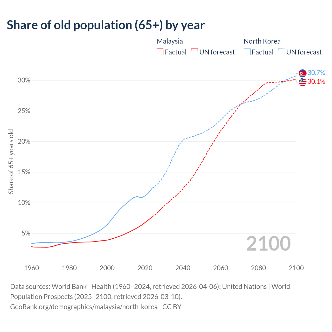 The share of older people aged 65 and over is 7.74% in Malaysia and 12.4% in North Korea. Life expectancy in Malaysia compared to North Korea .
