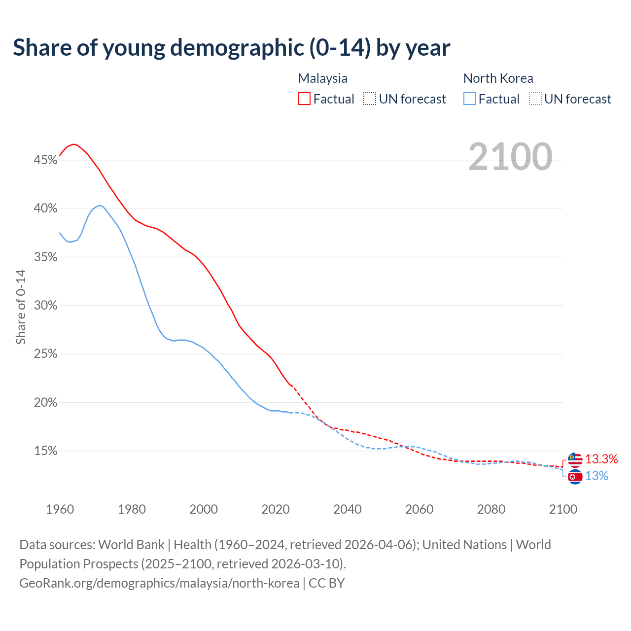 - The share of young demographic (0-15 years old) in Malaysia is 21.8% vs 18.9% in North Korea.