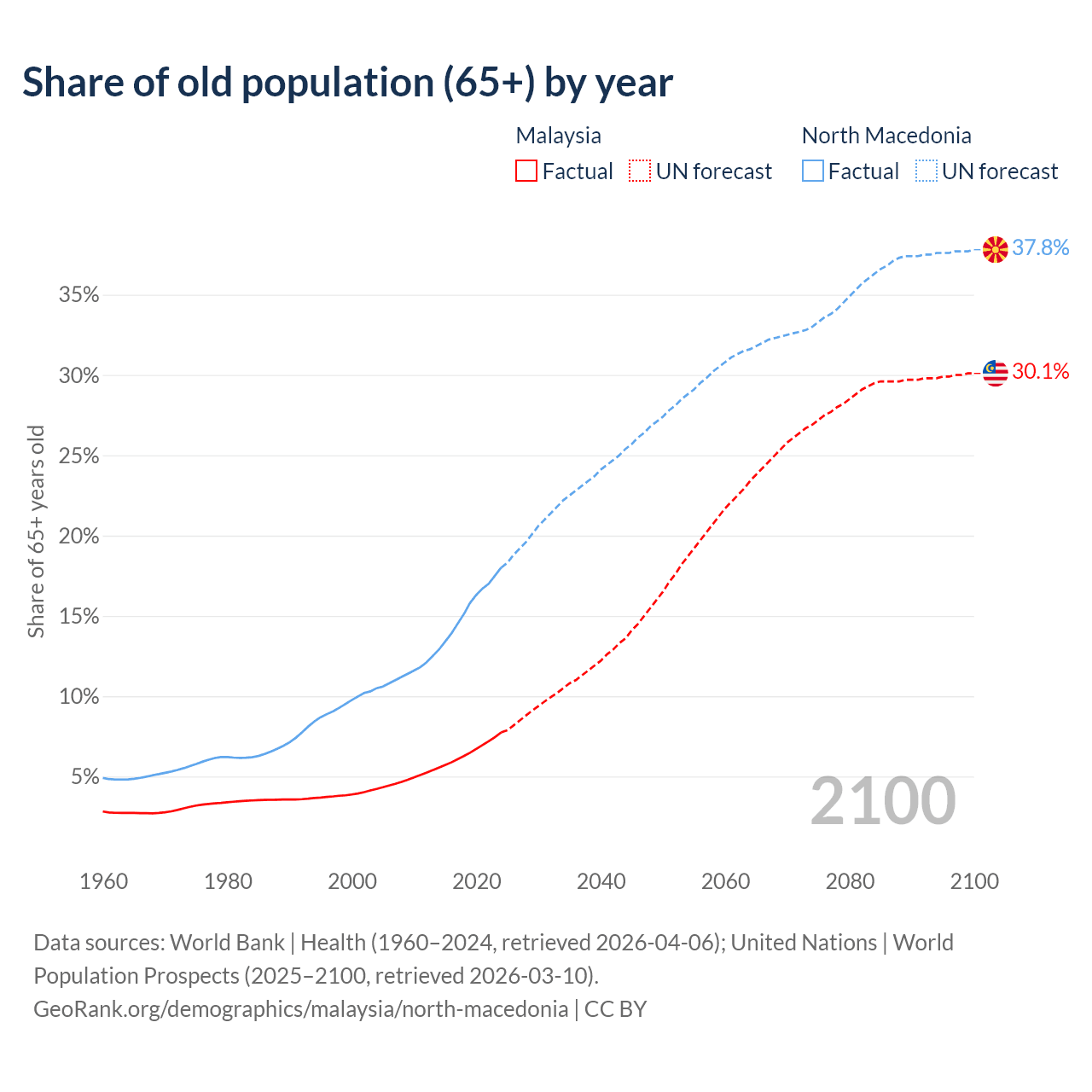 The share of older people aged 65 and over is 7.74% in Malaysia and 18% in North Macedonia. Life expectancy in Malaysia compared to North Macedonia .