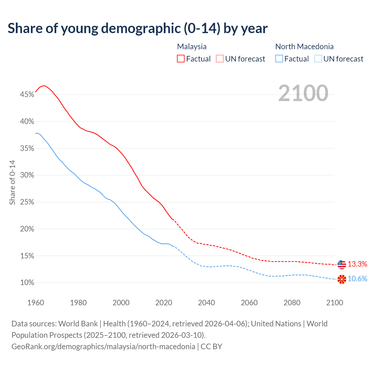 - The share of young demographic (0-15 years old) in Malaysia is 21.8% vs 16.8% in North Macedonia.