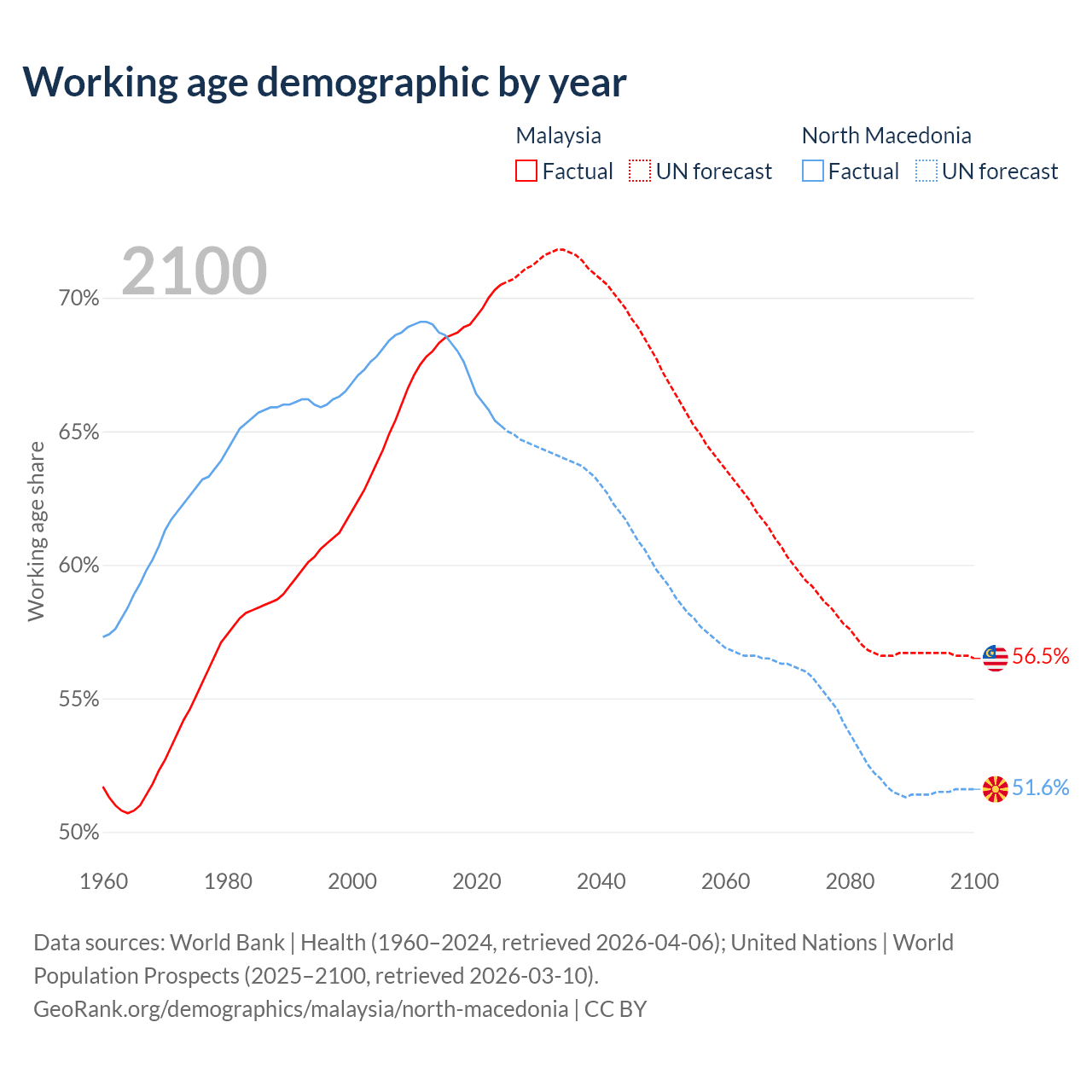 - Malaysia has 25.7M working age adults (aged 15-64) vs 1.18M in North Macedonia.