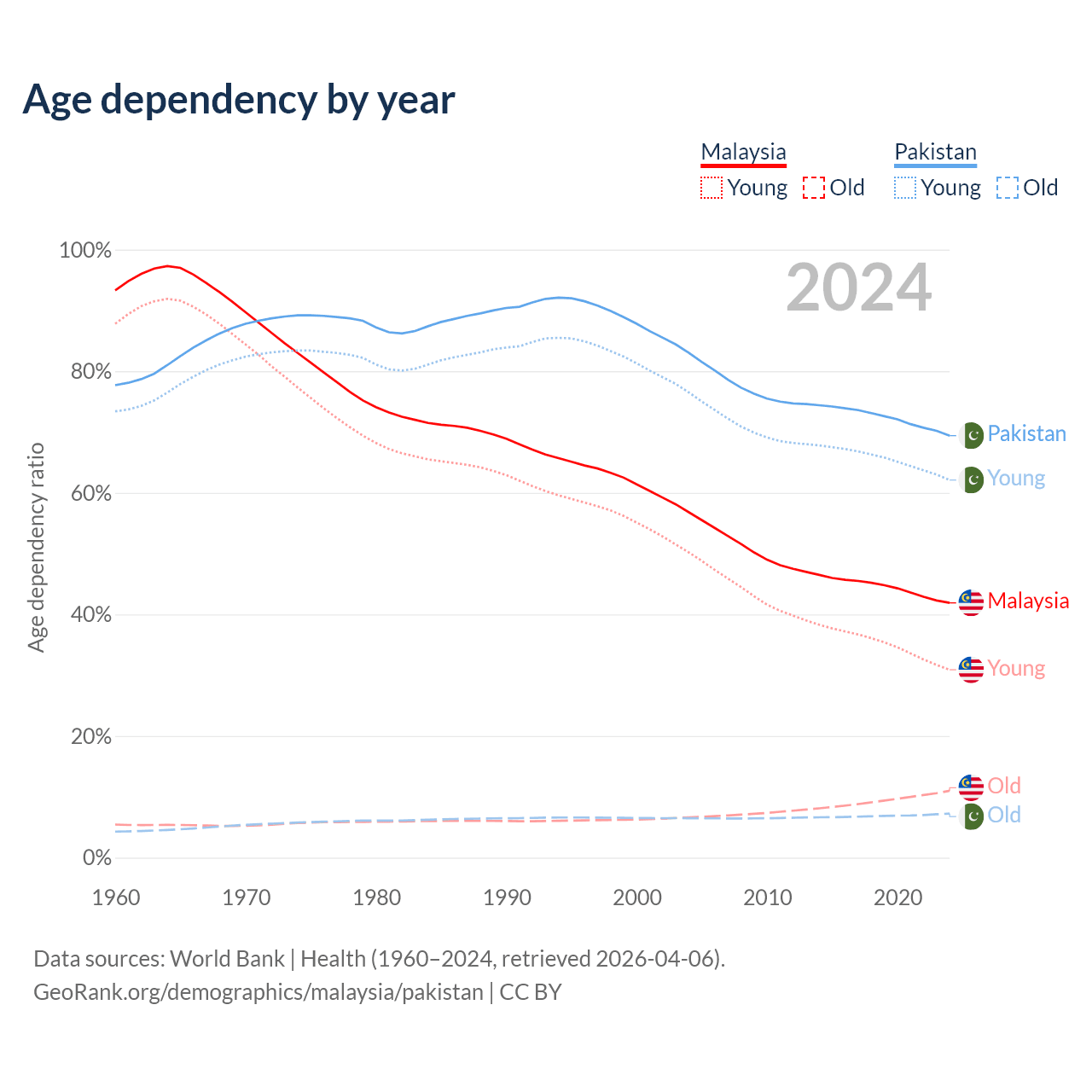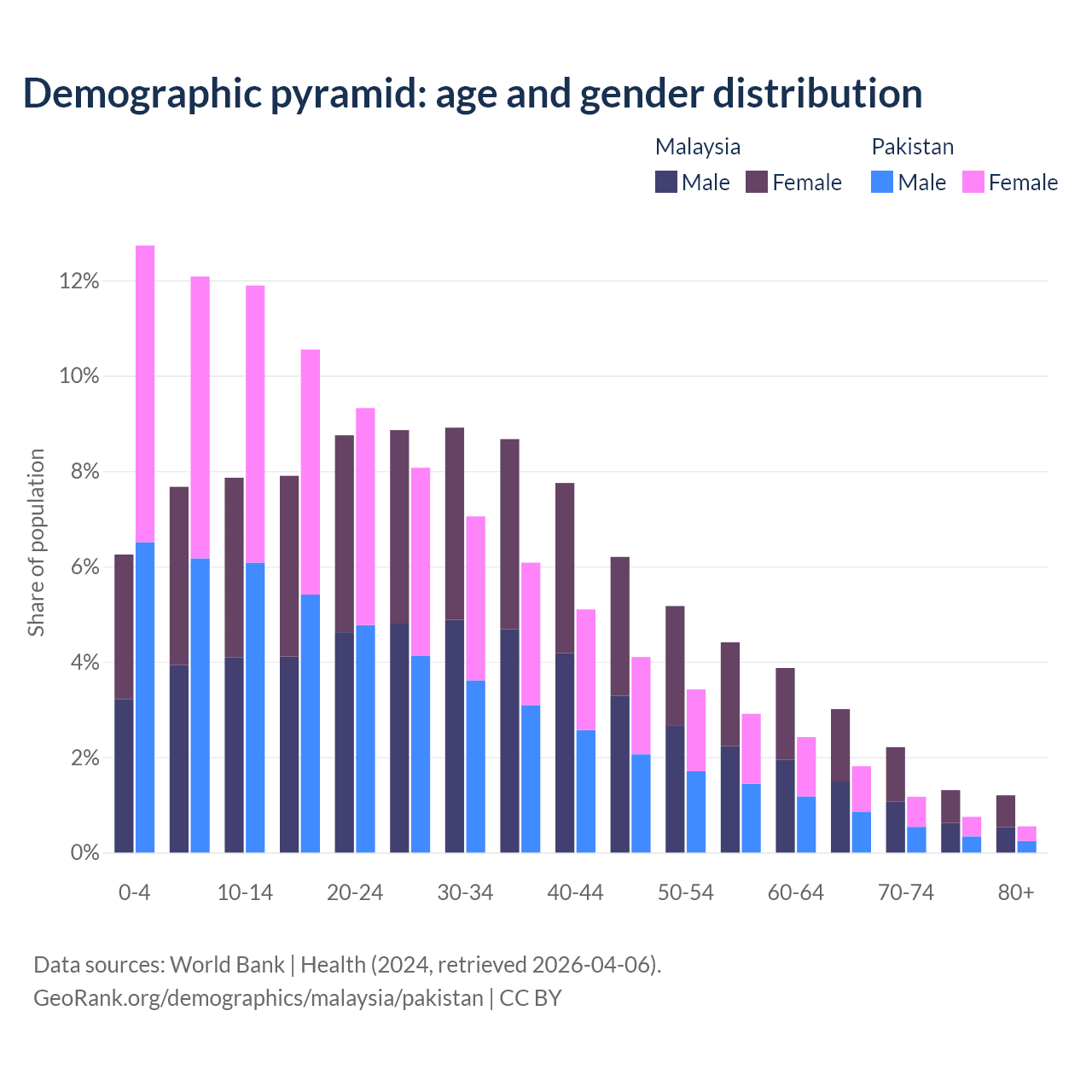 - Malaysia is ranked 92/196 by median age (oldest to youngest) vs 154/196 for Pakistan.