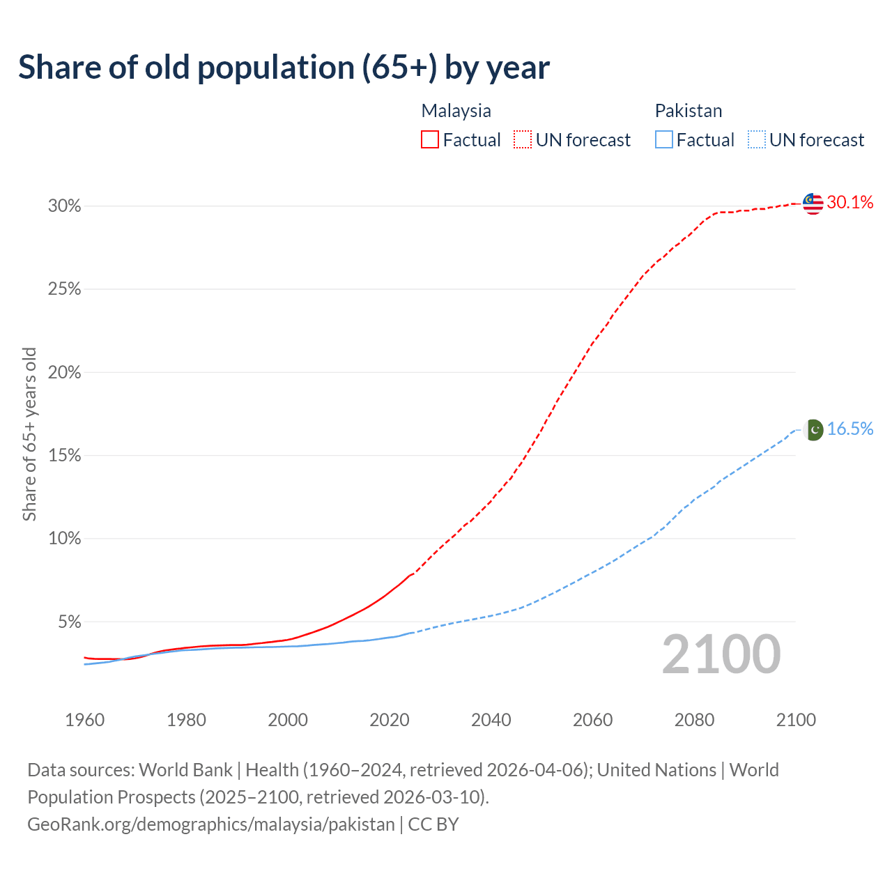The share of older people aged 65 and over is 7.74% in Malaysia and 4.28% in Pakistan. Life expectancy in Malaysia compared to Pakistan .