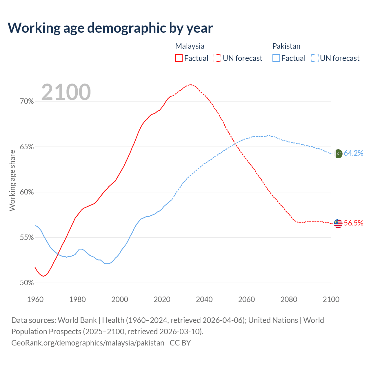 - Malaysia has 25.7M working age adults (aged 15-64) vs 154M in Pakistan.