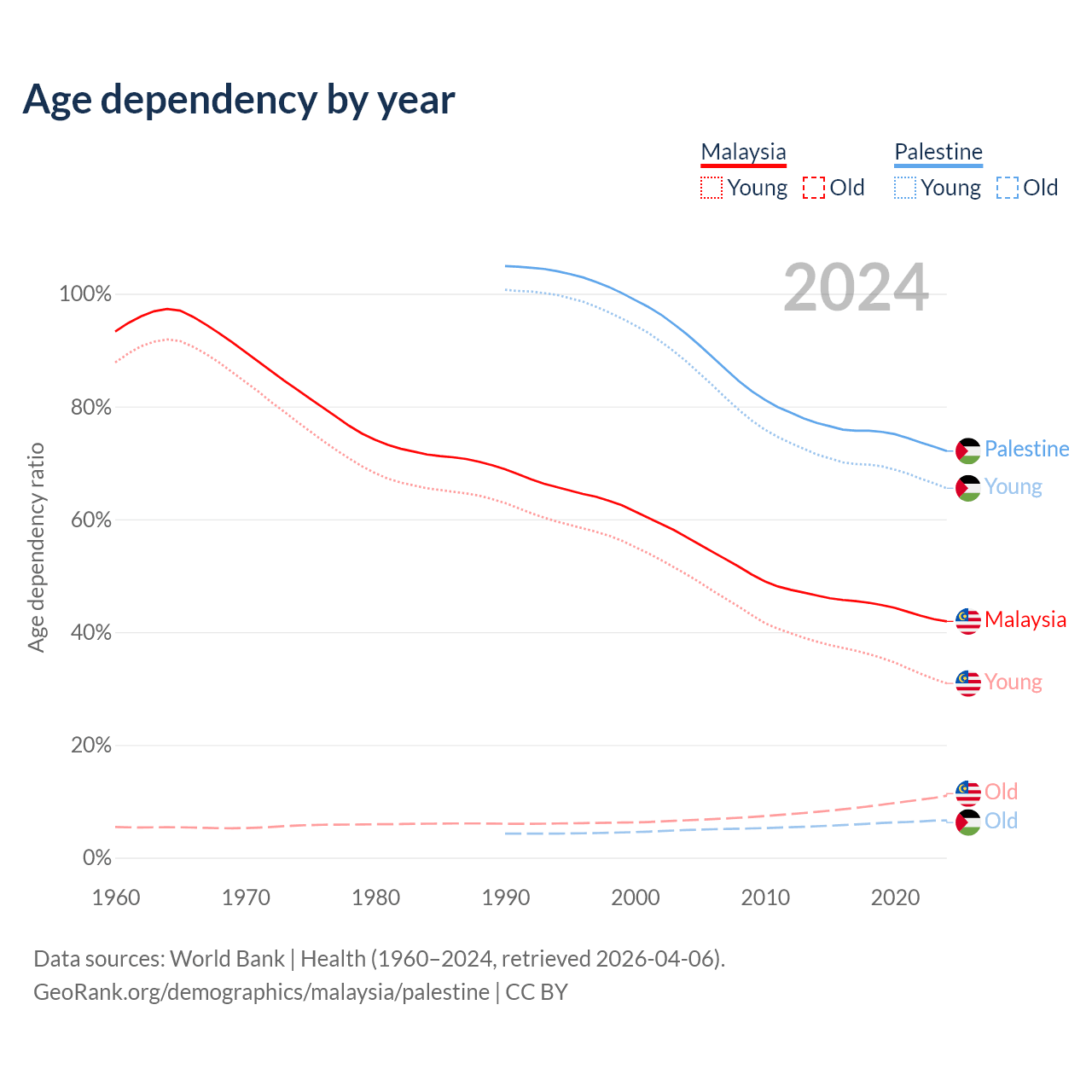 Data sources: World Bank | Health (1960–2024, retrieved 2026-04-06); U.S. Census Bureau (1960–2024, retrieved 2026-02-08).