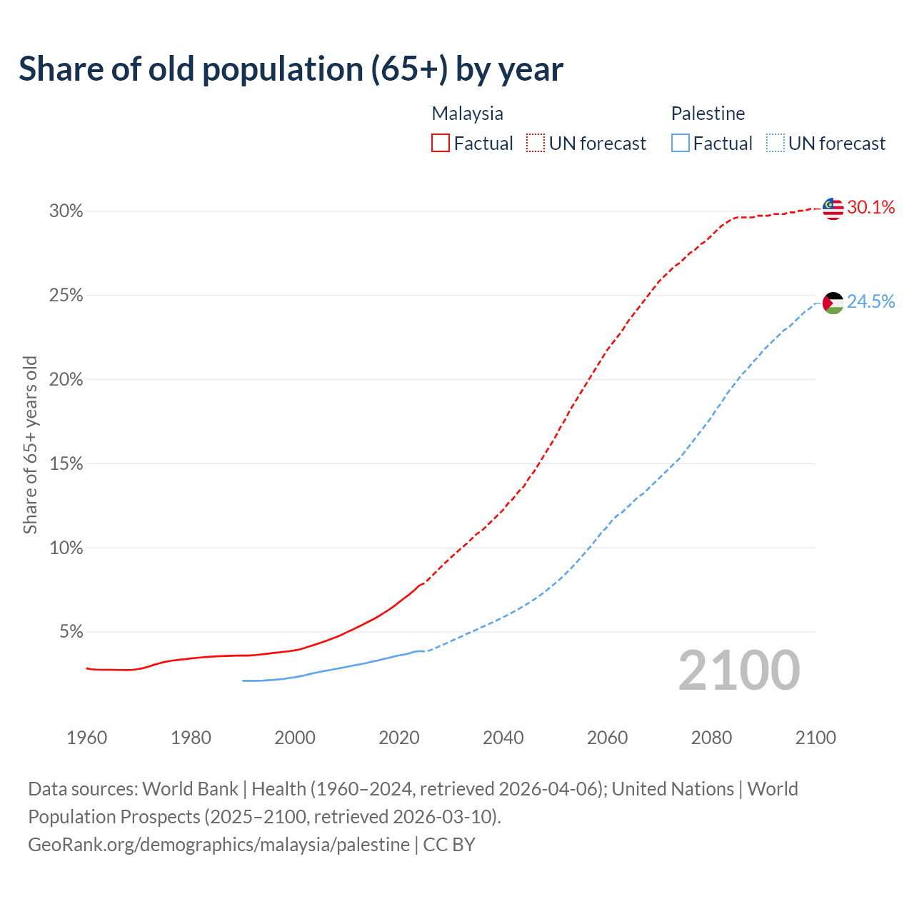 The share of older people aged 65 and over is 7.74% in Malaysia and 3.84% in Palestine. Life expectancy in Malaysia compared to Palestine .