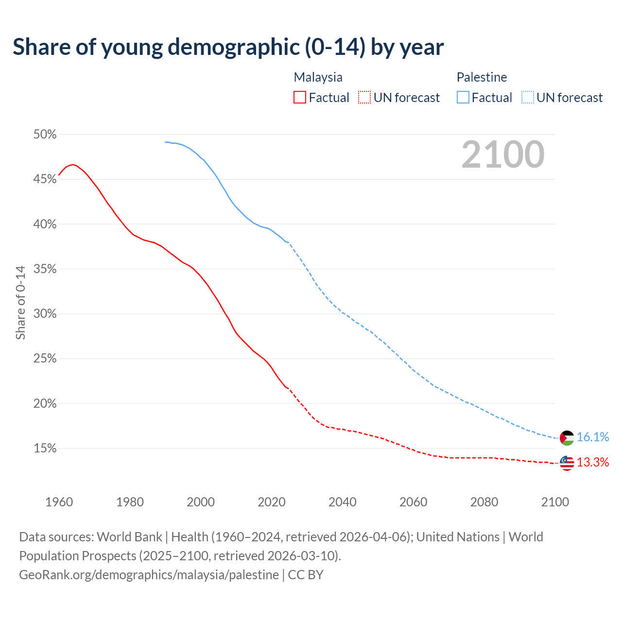- The share of young demographic (0-15 years old) in Malaysia is 21.8% vs 38% in Palestine.