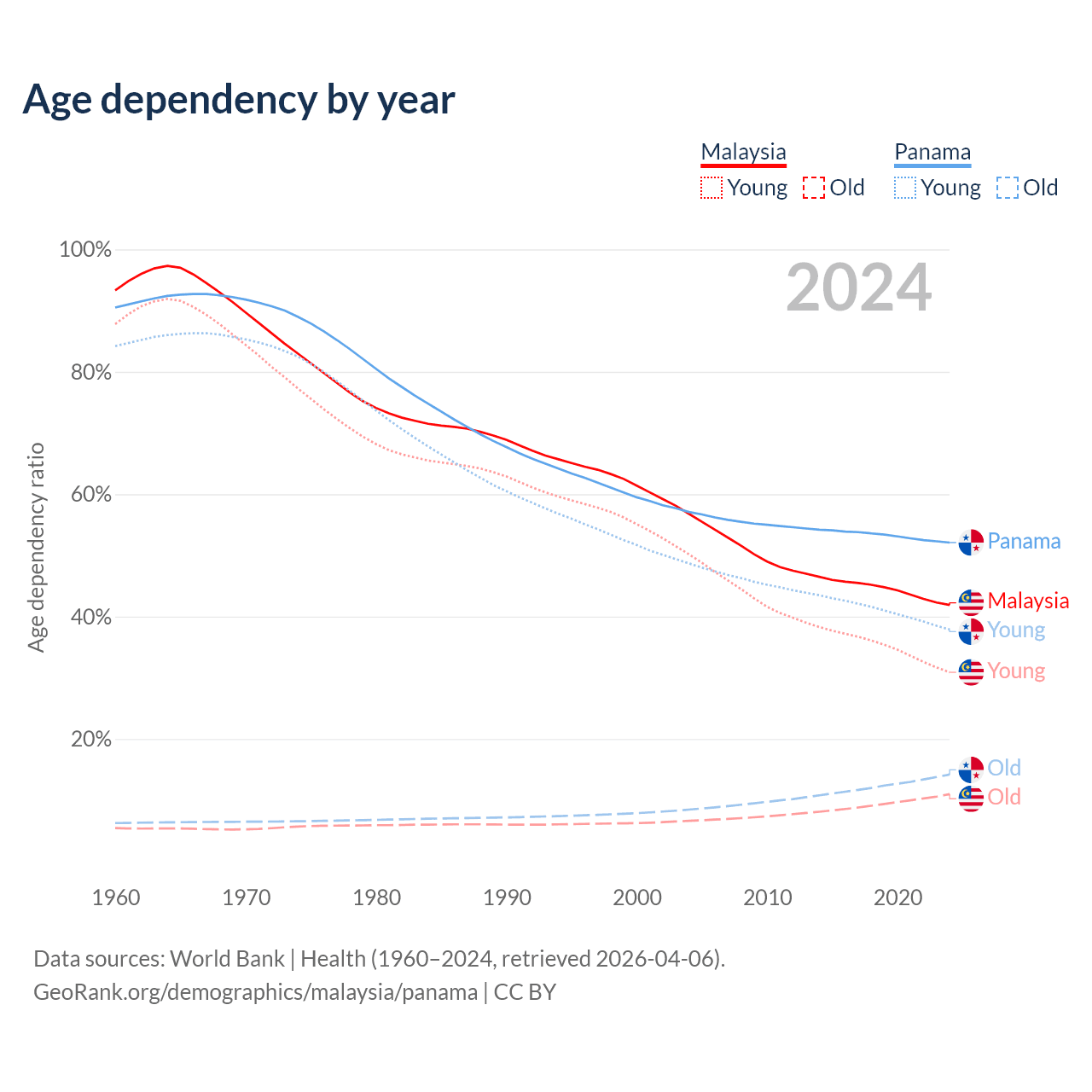 - Malaysia is ranked 92/196 by median age (oldest to youngest) vs 94/196 for Panama.