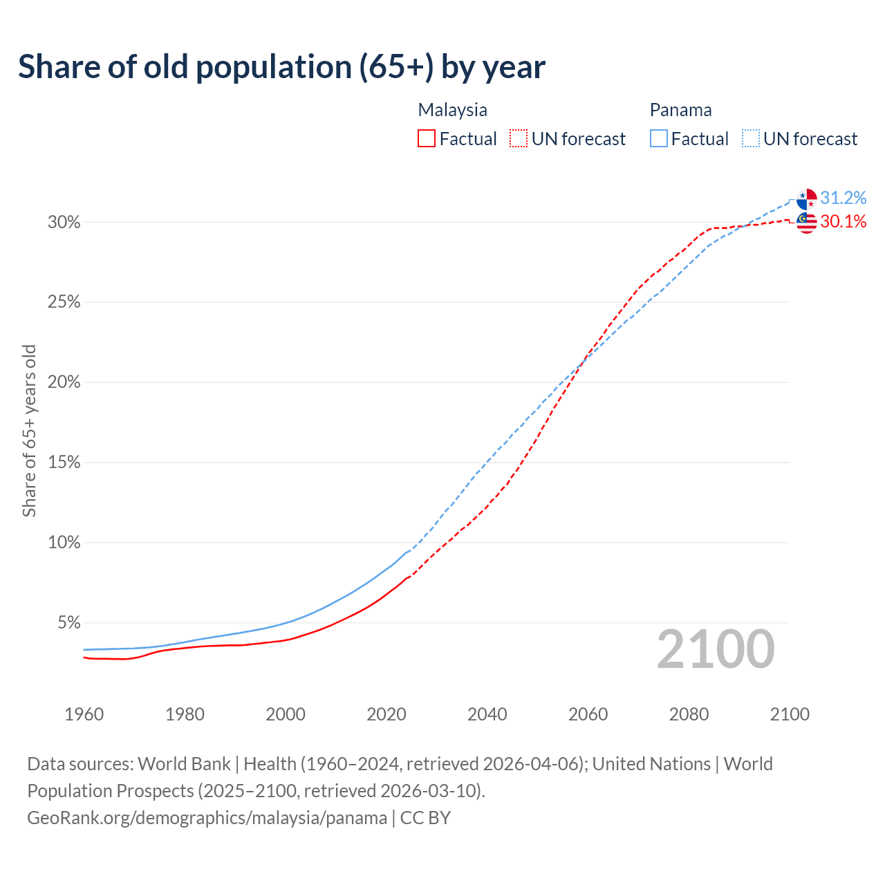 The share of older people aged 65 and over is 7.74% in Malaysia and 9.35% in Panama. Life expectancy in Malaysia compared to Panama .