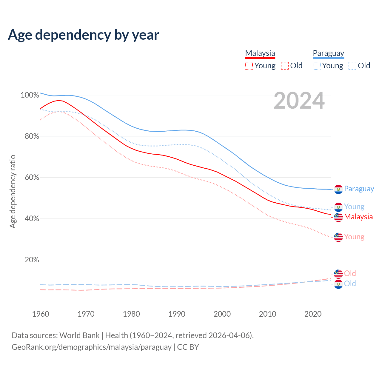 Data sources: World Bank | Health (1960–2024, retrieved 2026-04-06); U.S. Census Bureau (1960–2024, retrieved 2026-02-08).