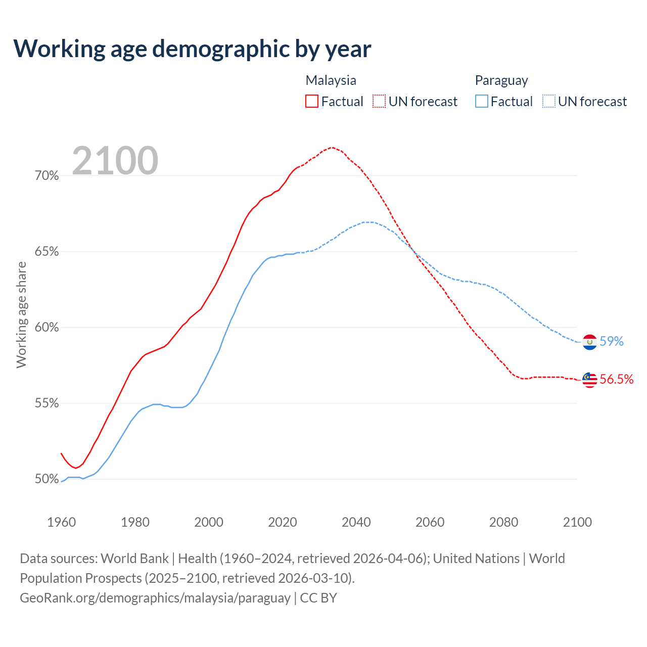 The share of older people aged 65 and over is 7.74% in Malaysia and 6.54% in Paraguay. Life expectancy in Malaysia compared to Paraguay .
