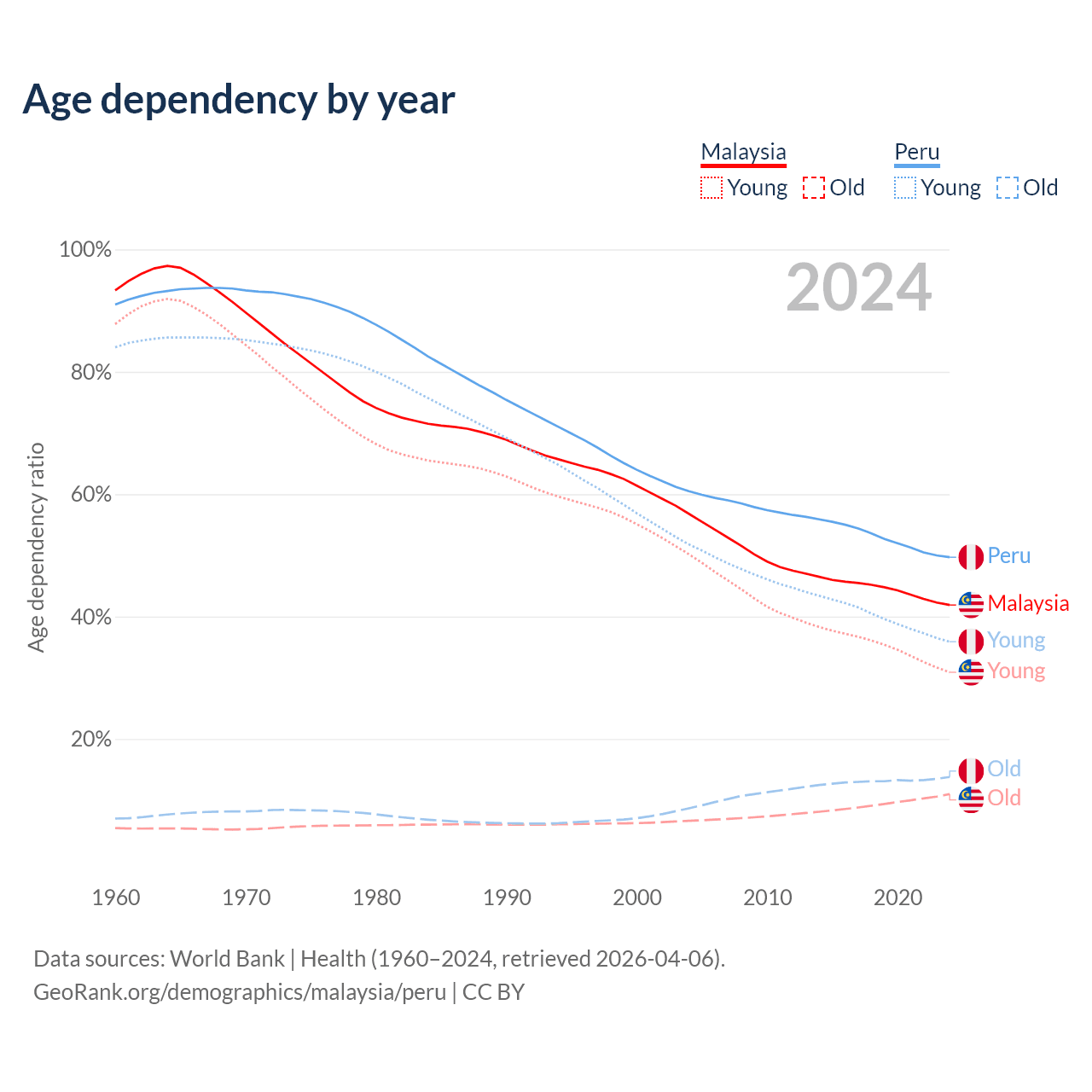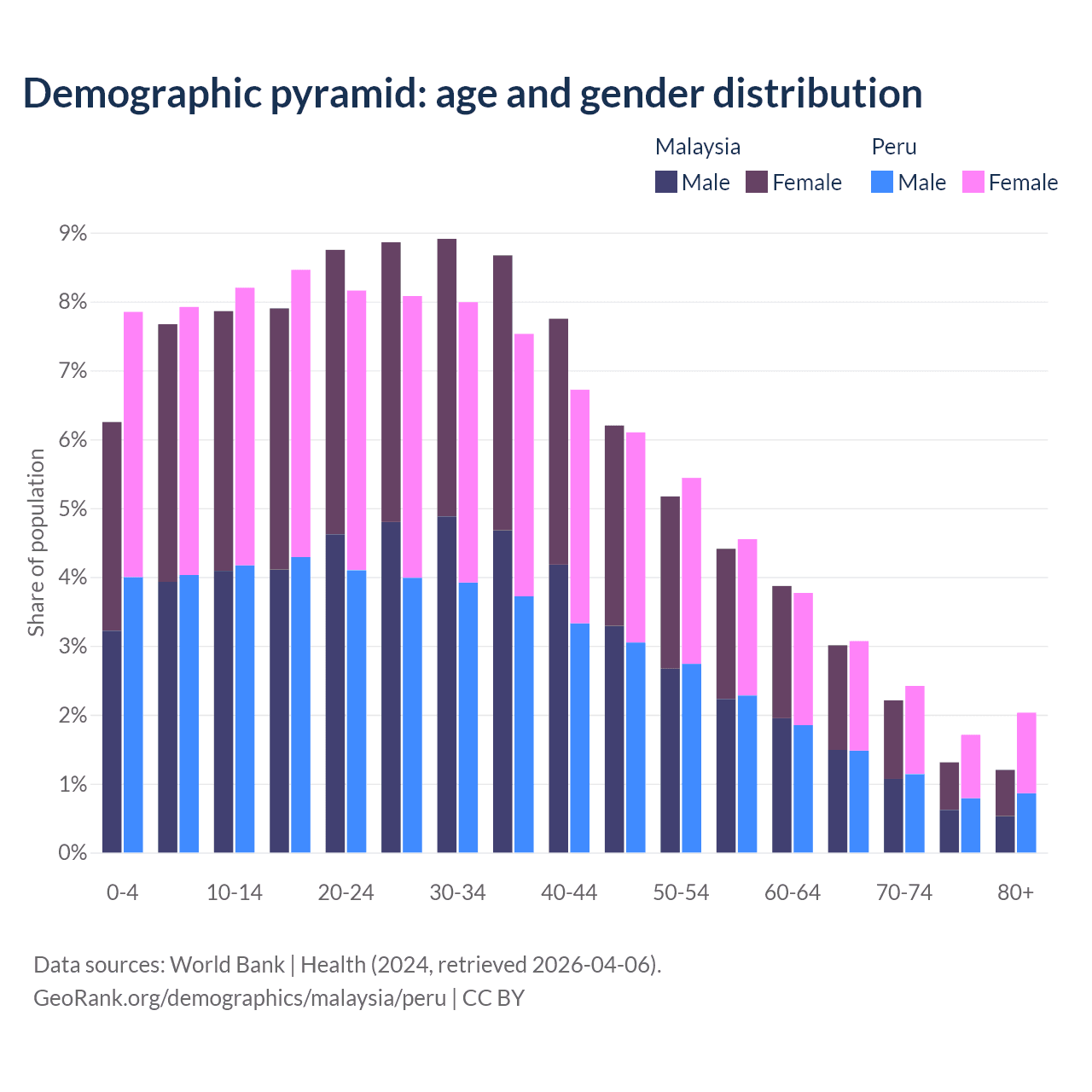 - Malaysia is ranked 92/196 by median age (oldest to youngest) vs 97/196 for Peru.