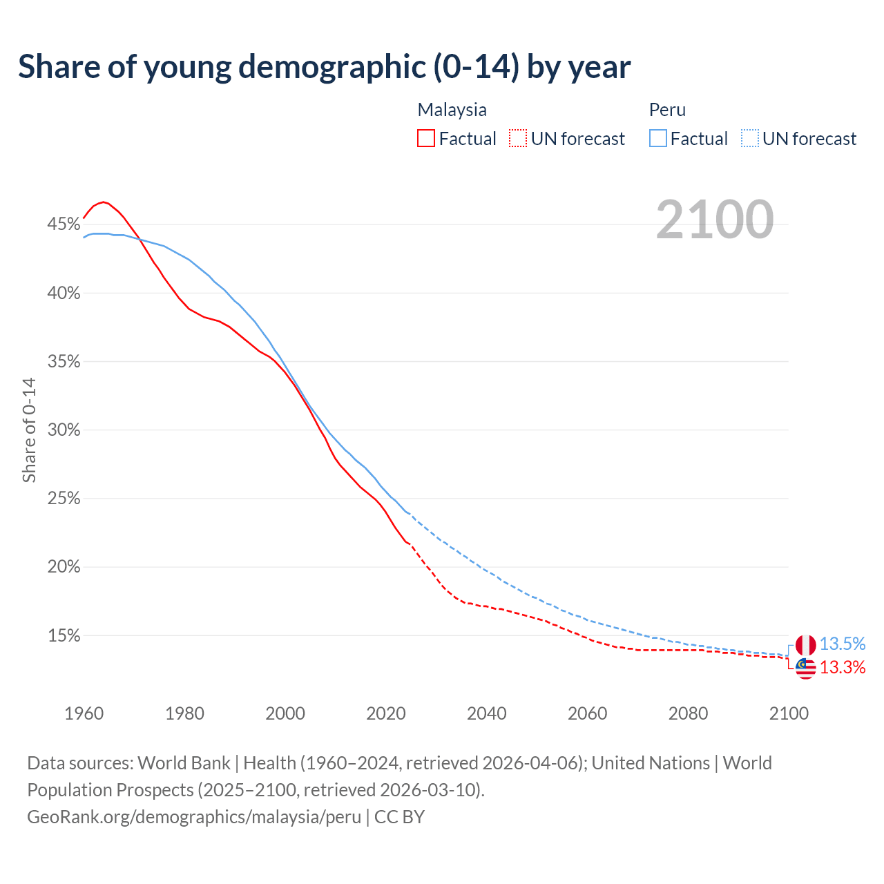 Median age Malaysia vs Peru, 1960-2100
