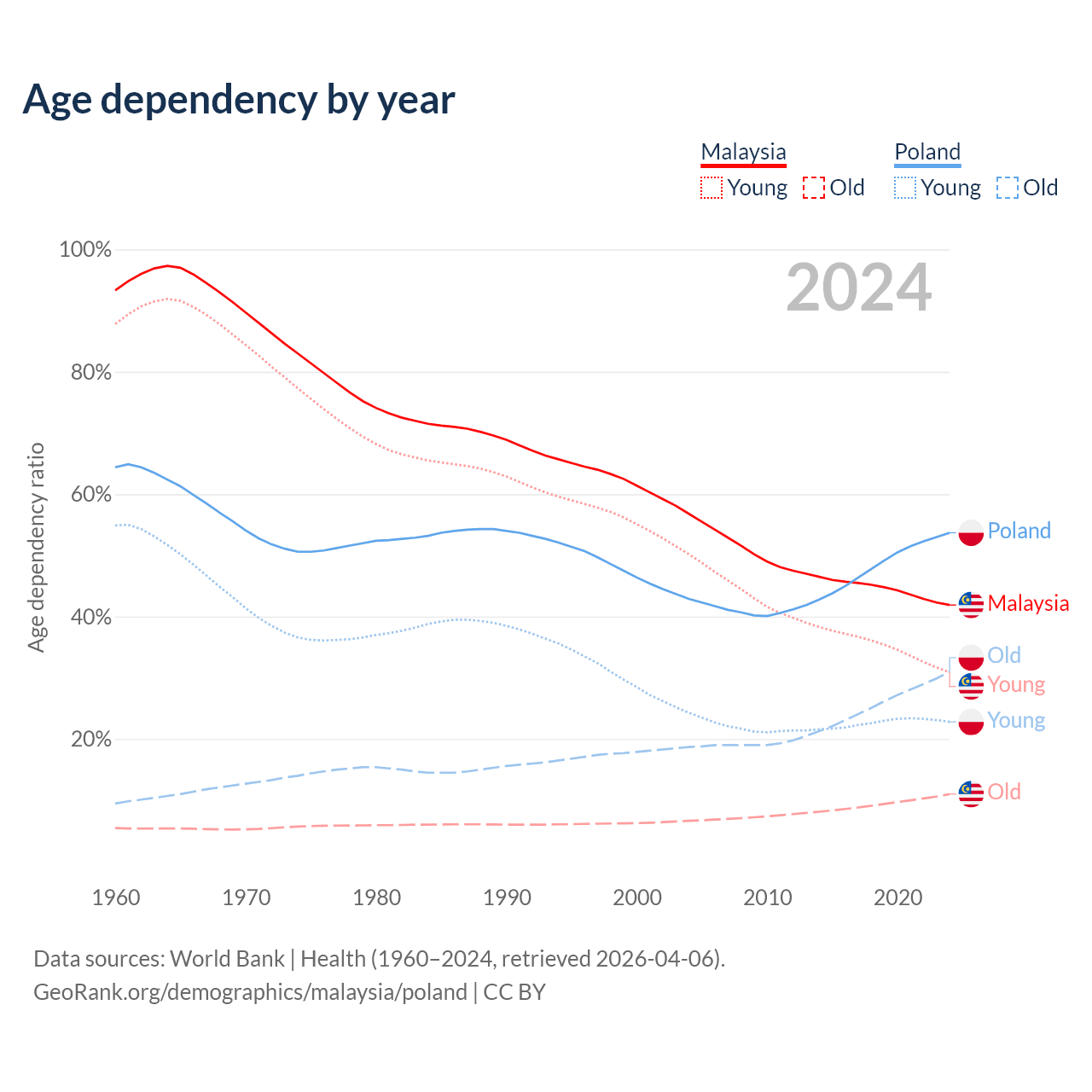The share of older people aged 65 and over is 7.74% in Malaysia and 20.1% in Poland. Life expectancy in Malaysia compared to Poland .