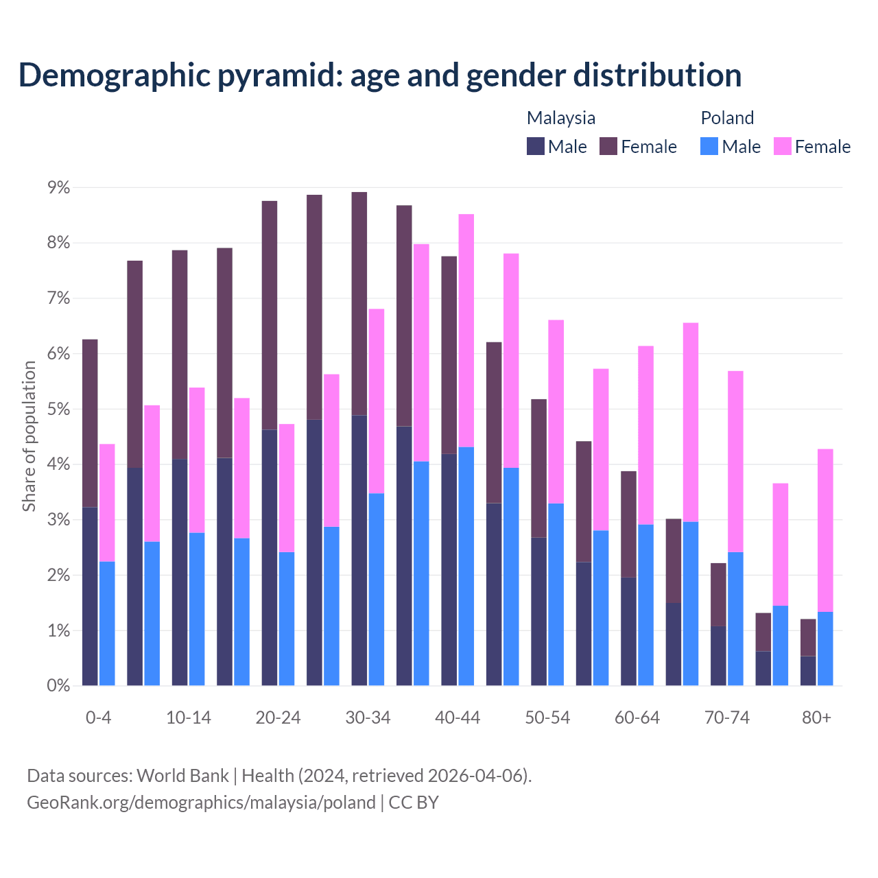 - Malaysia is ranked 92/196 by median age (oldest to youngest) vs 30/196 for Poland.