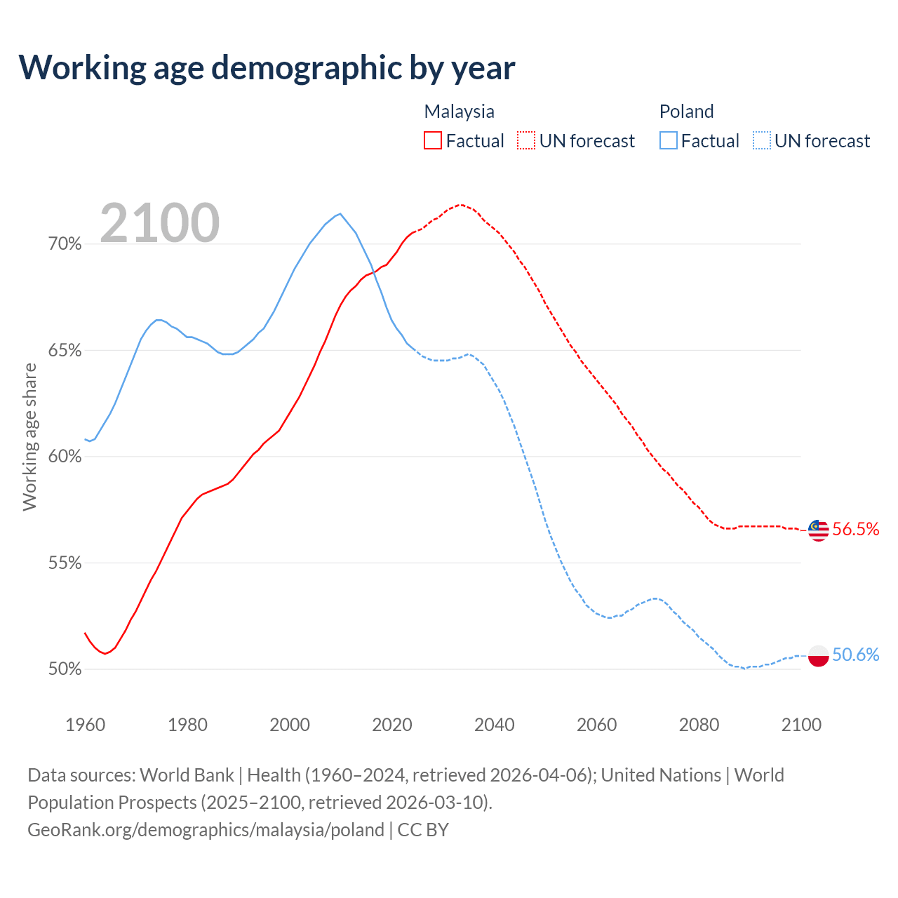 Median age Malaysia vs Poland, 1960-2100