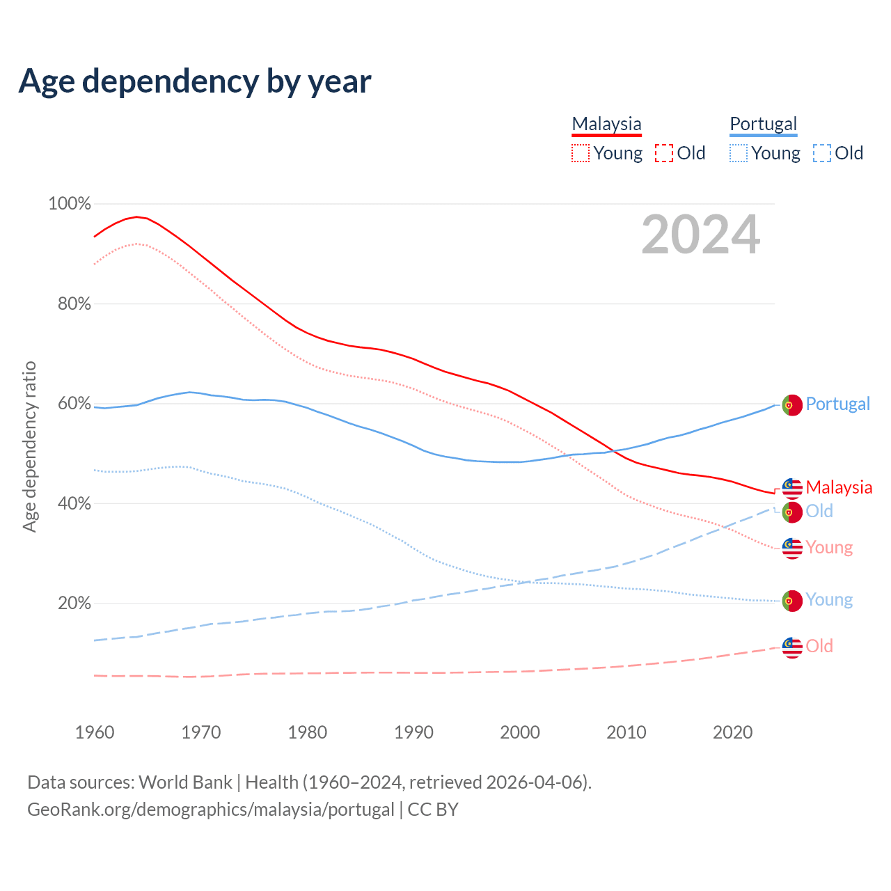 - Malaysia is ranked 92/196 by median age (oldest to youngest) vs 5/196 for Portugal.