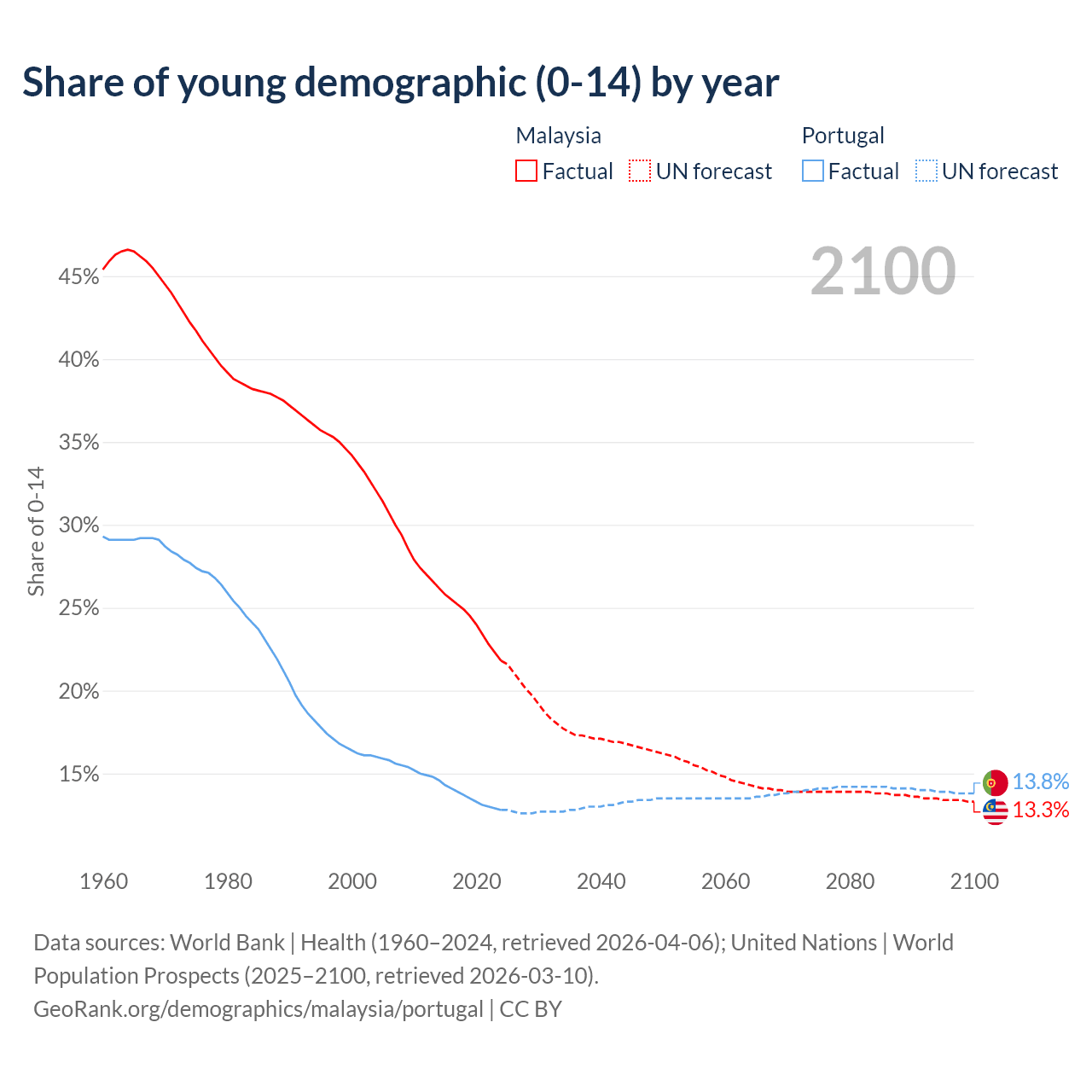 - The share of young demographic (0-15 years old) in Malaysia is 21.8% vs 12.8% in Portugal.