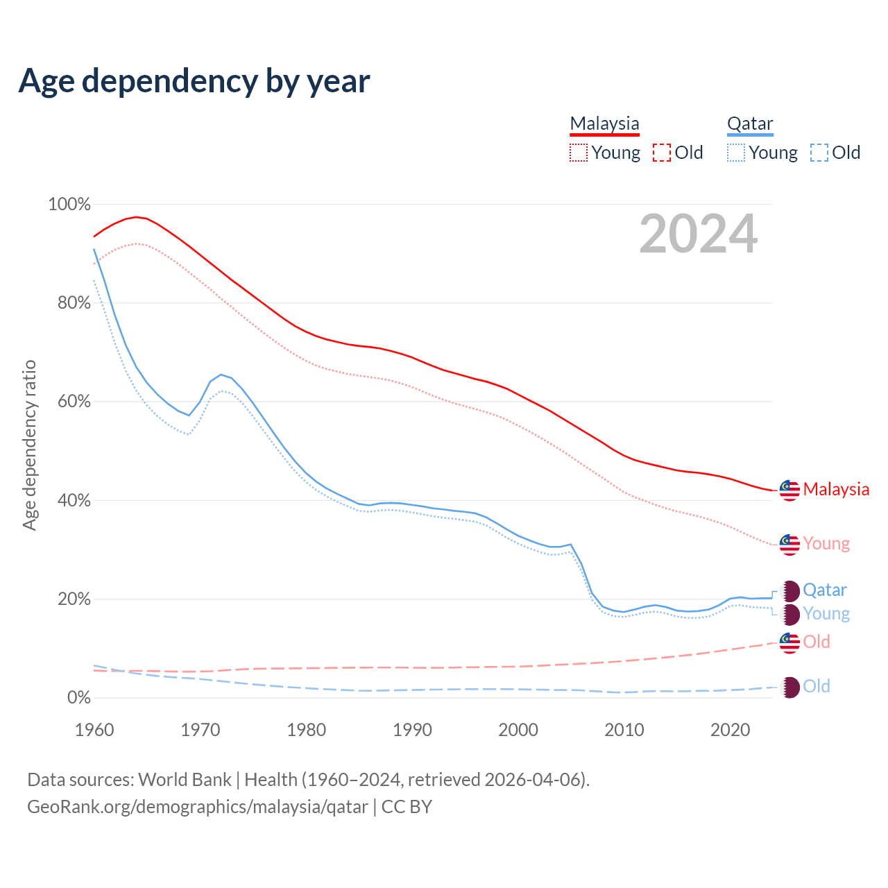 - Malaysia is ranked 92/196 by median age (oldest to youngest) vs 78/196 for Qatar.