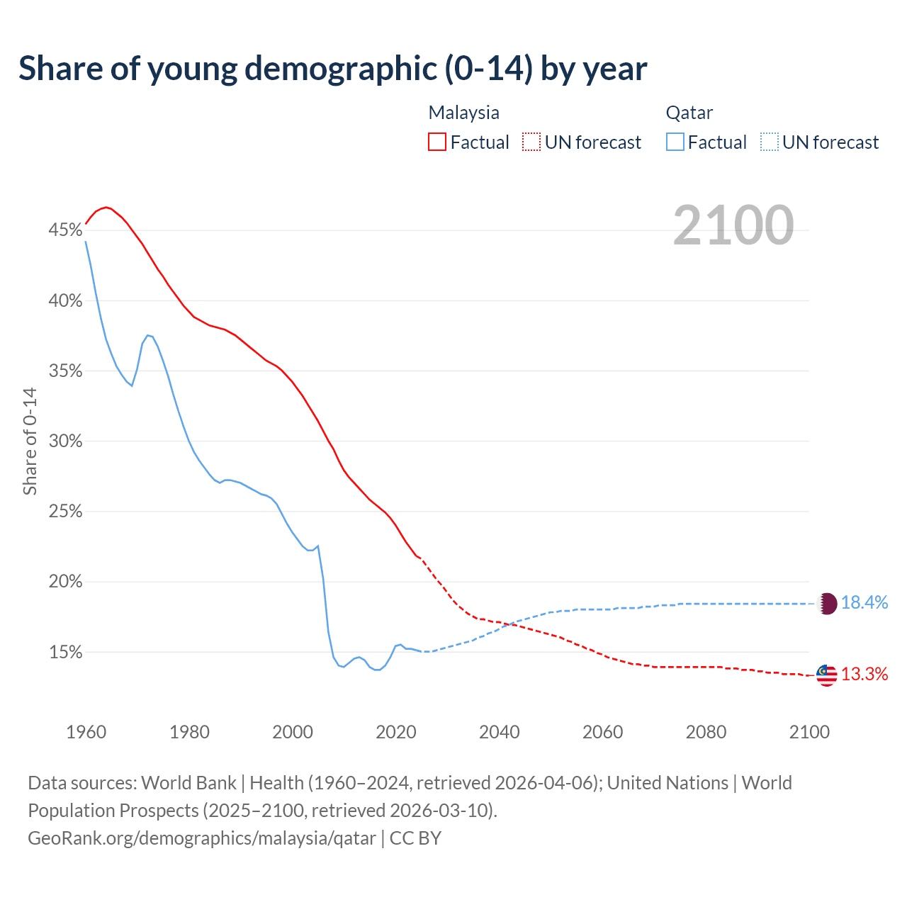 - The share of young demographic (0-15 years old) in Malaysia is 21.8% vs 15.1% in Qatar.