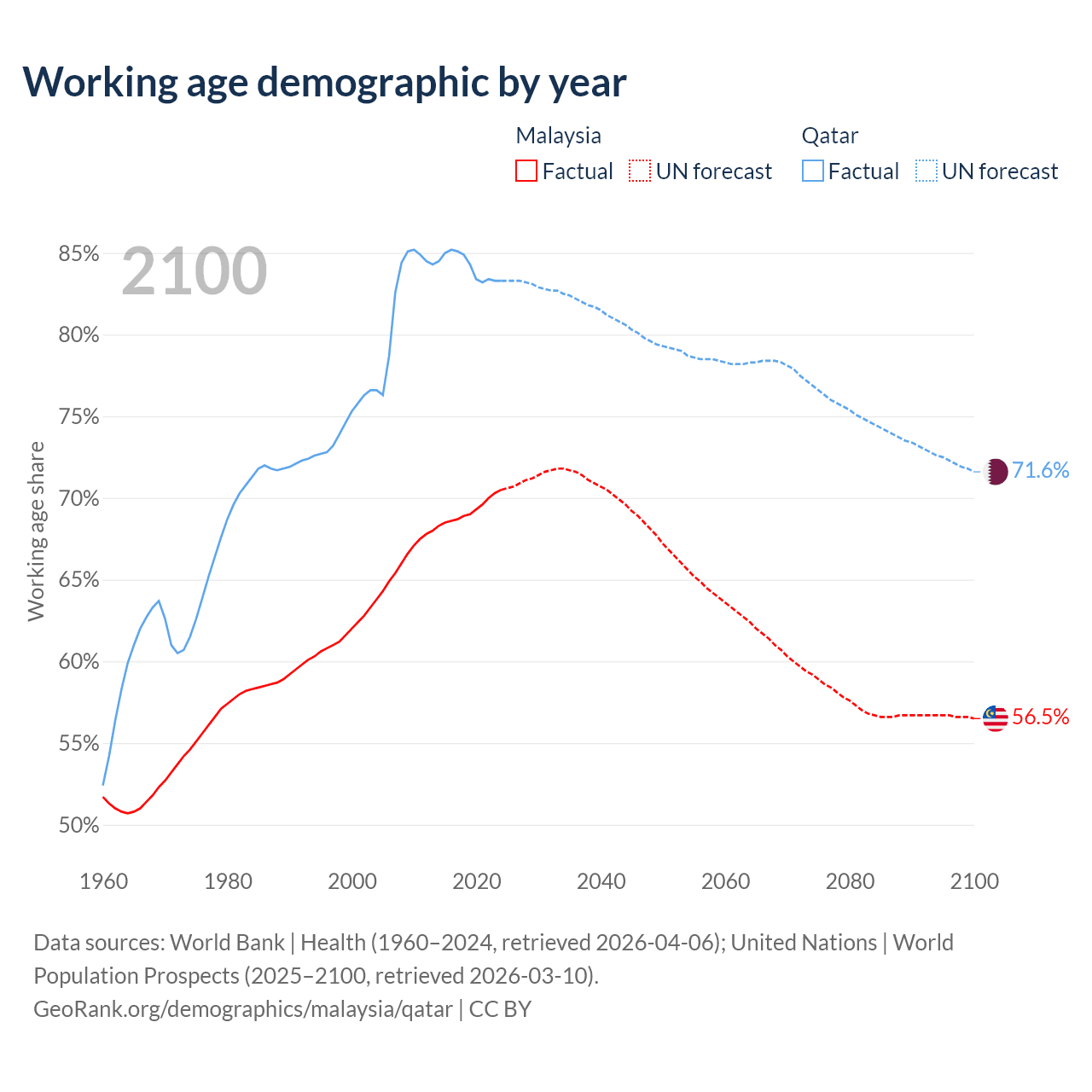 - Malaysia has 25.7M working age adults (aged 15-64) vs 2.5M in Qatar.