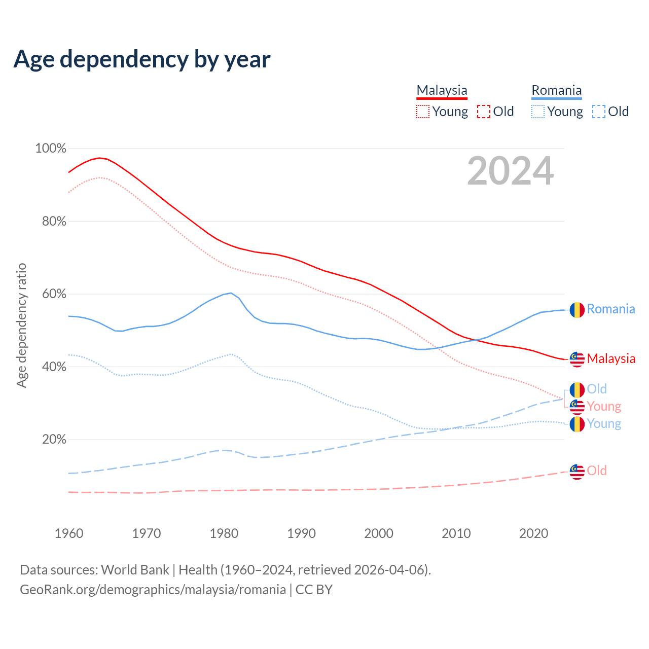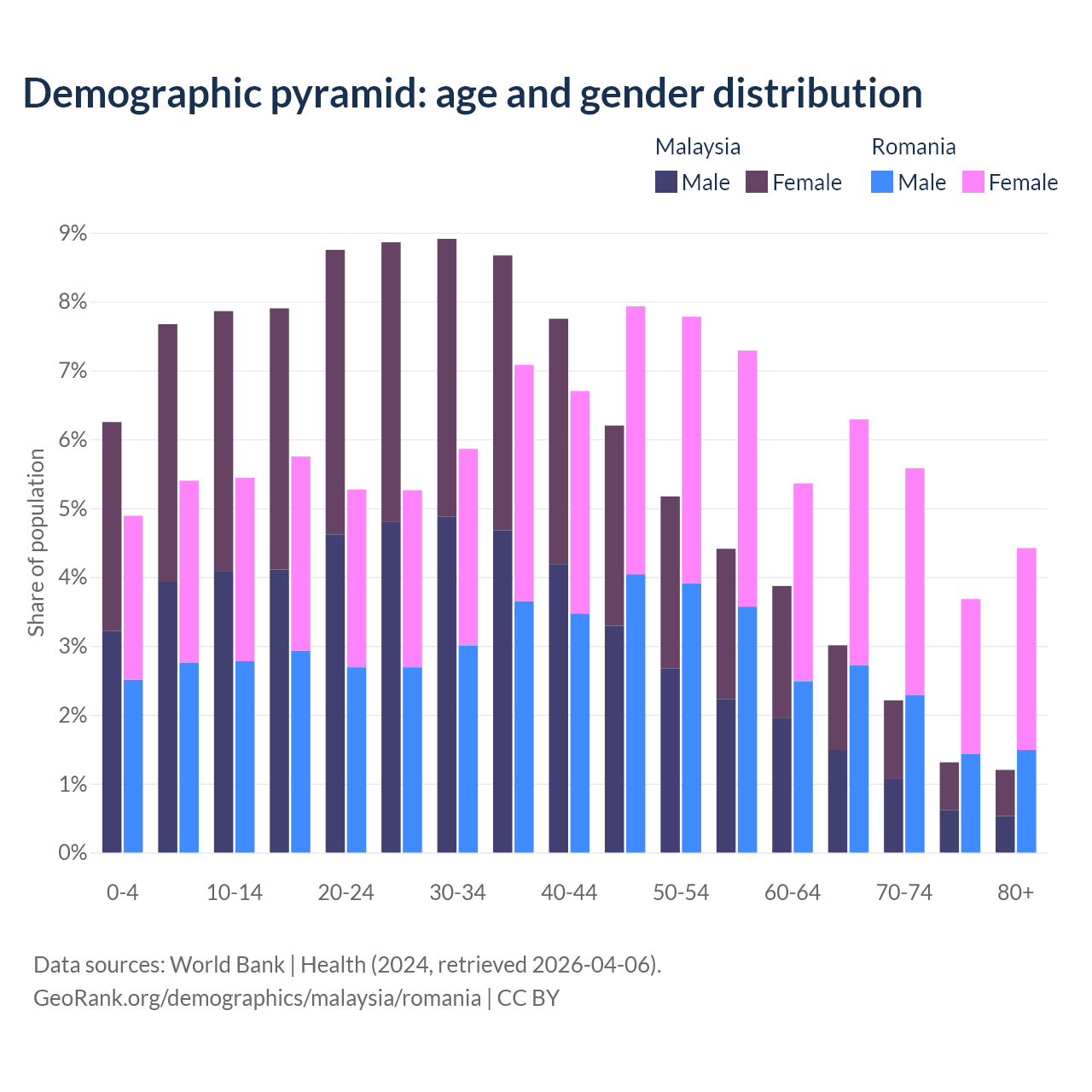 - Malaysia is ranked 92/196 by median age (oldest to youngest) vs 23/196 for Romania.
