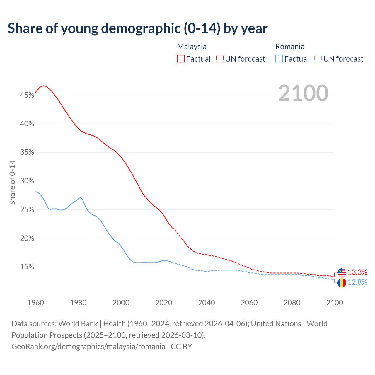 - The share of young demographic (0-15 years old) in Malaysia is 21.8% vs 15.7% in Romania.
