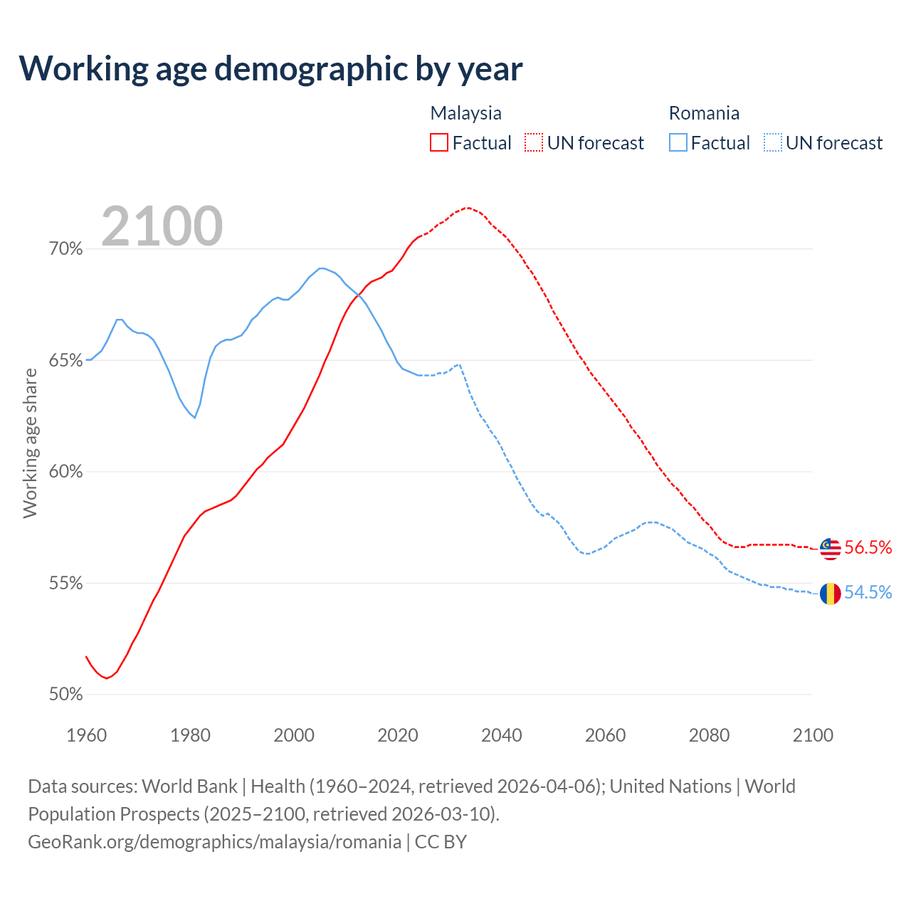 - Malaysia has 25.7M working age adults (aged 15-64) vs 12.1M in Romania.