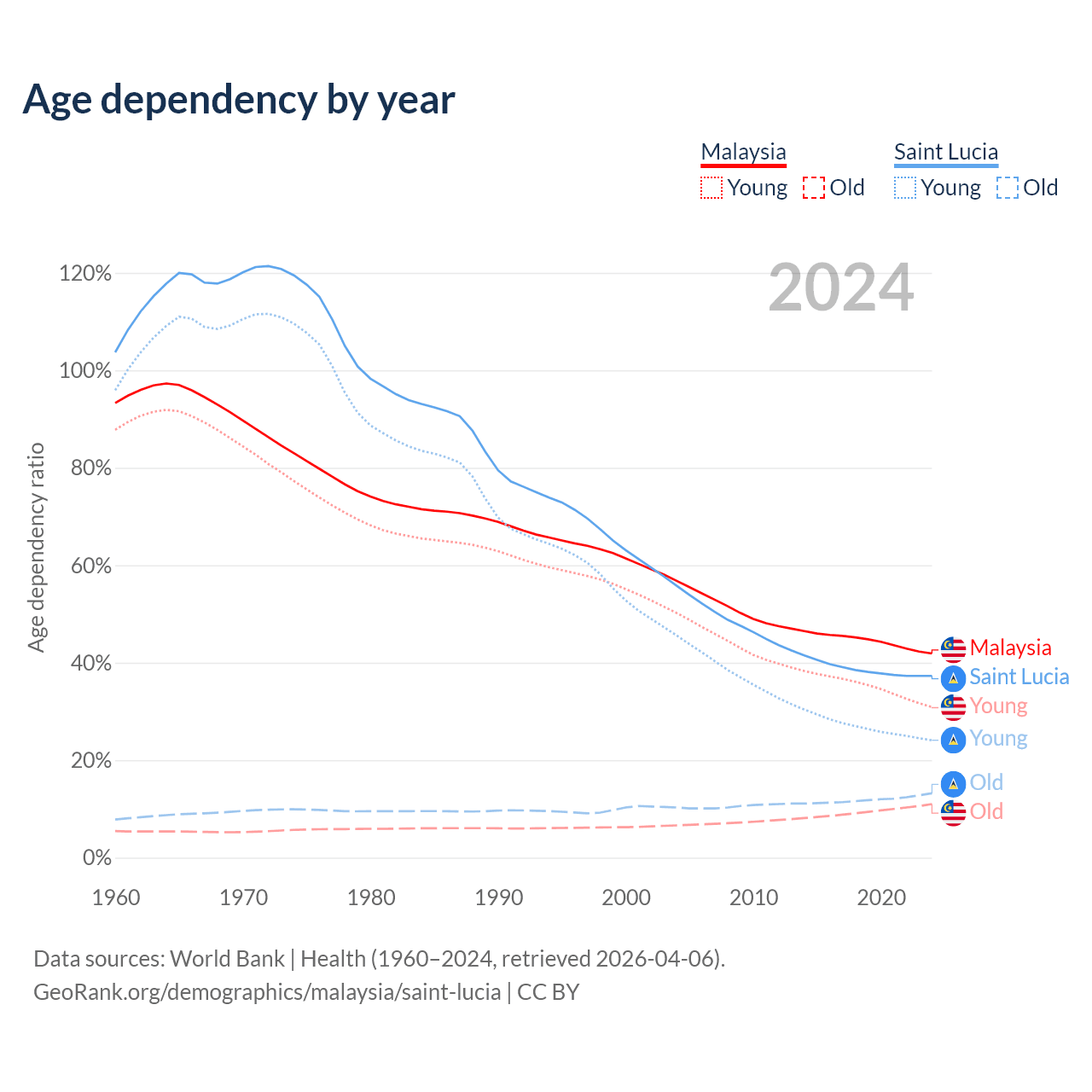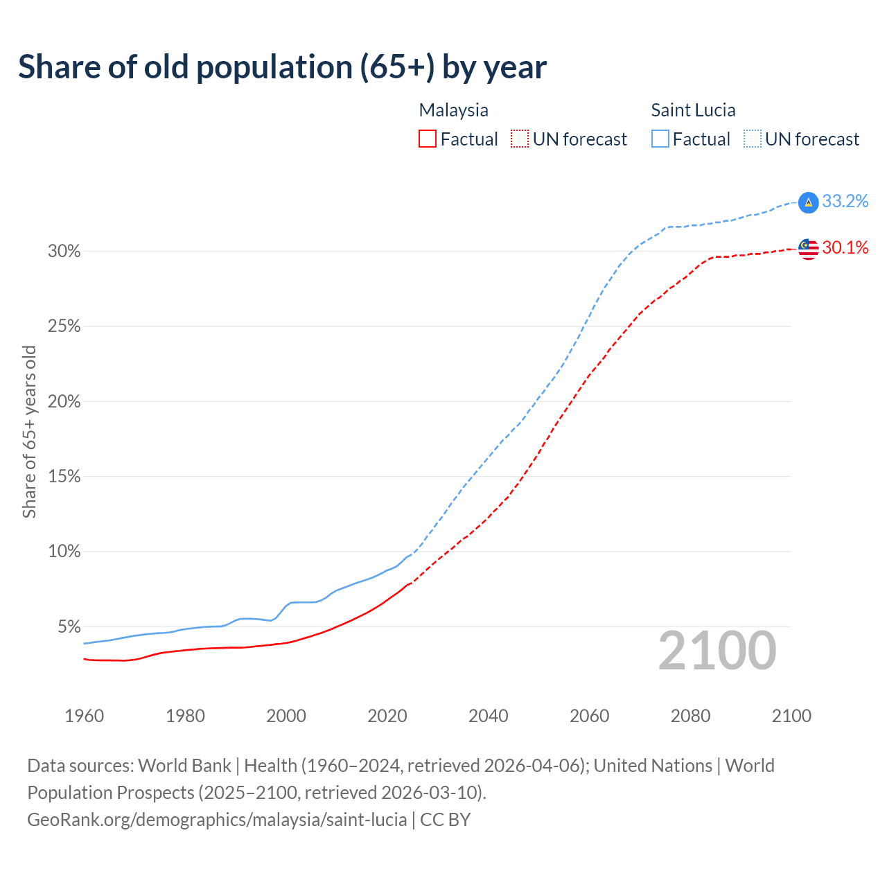 - The share of old-age demographic (65+) in Malaysia is 7.74% vs 9.62% in Saint Lucia.