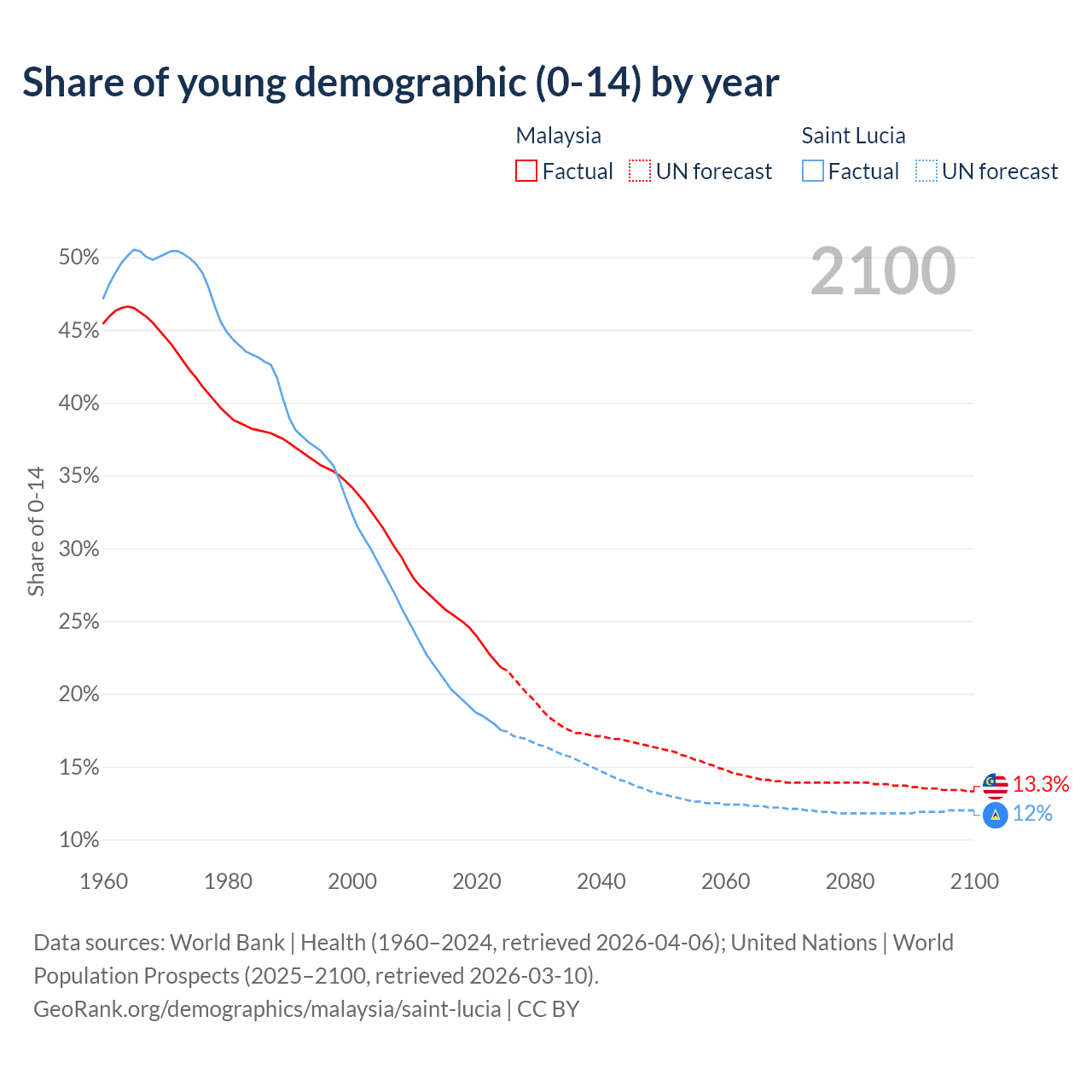 - The share of young demographic (0-15 years old) in Malaysia is 21.8% vs 17.5% in Saint Lucia.