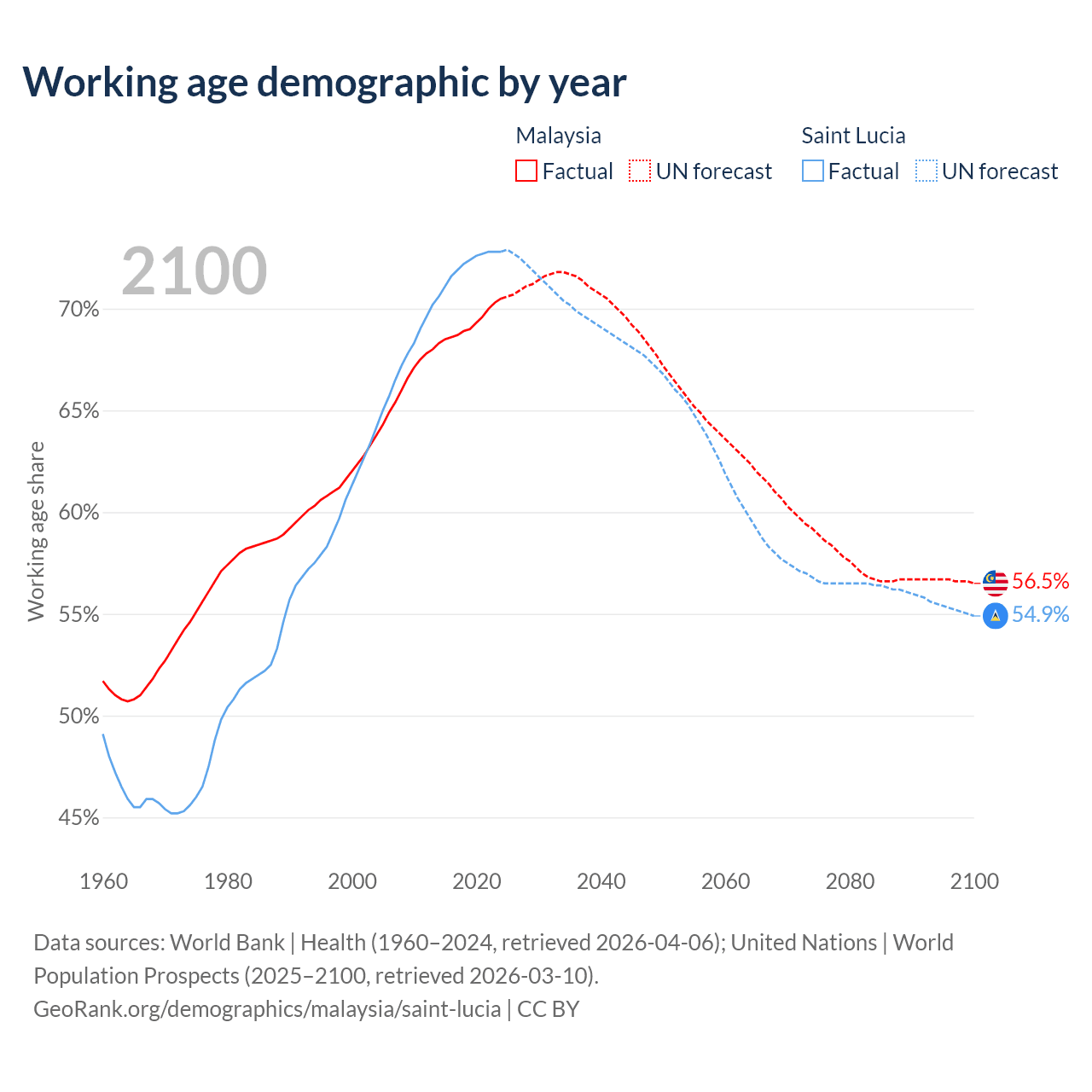 - Malaysia has 25.7M working age adults (aged 15-64) vs 132K in Saint Lucia.