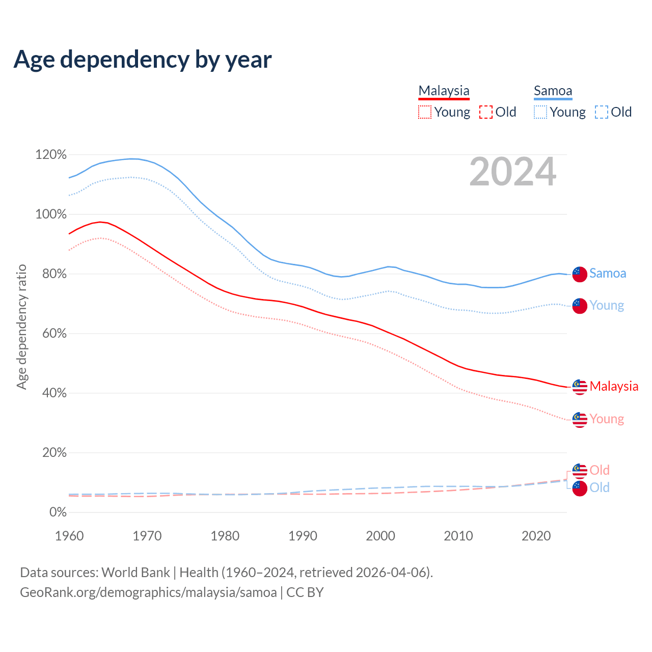 Data sources: World Bank | Health (1960–2024, retrieved 2026-04-06); U.S. Census Bureau (1960–2024, retrieved 2026-02-08).