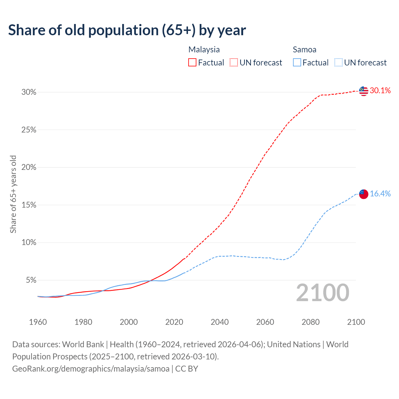 The share of older people aged 65 and over is 7.74% in Malaysia and 5.88% in Samoa. Life expectancy in Malaysia compared to Samoa .
