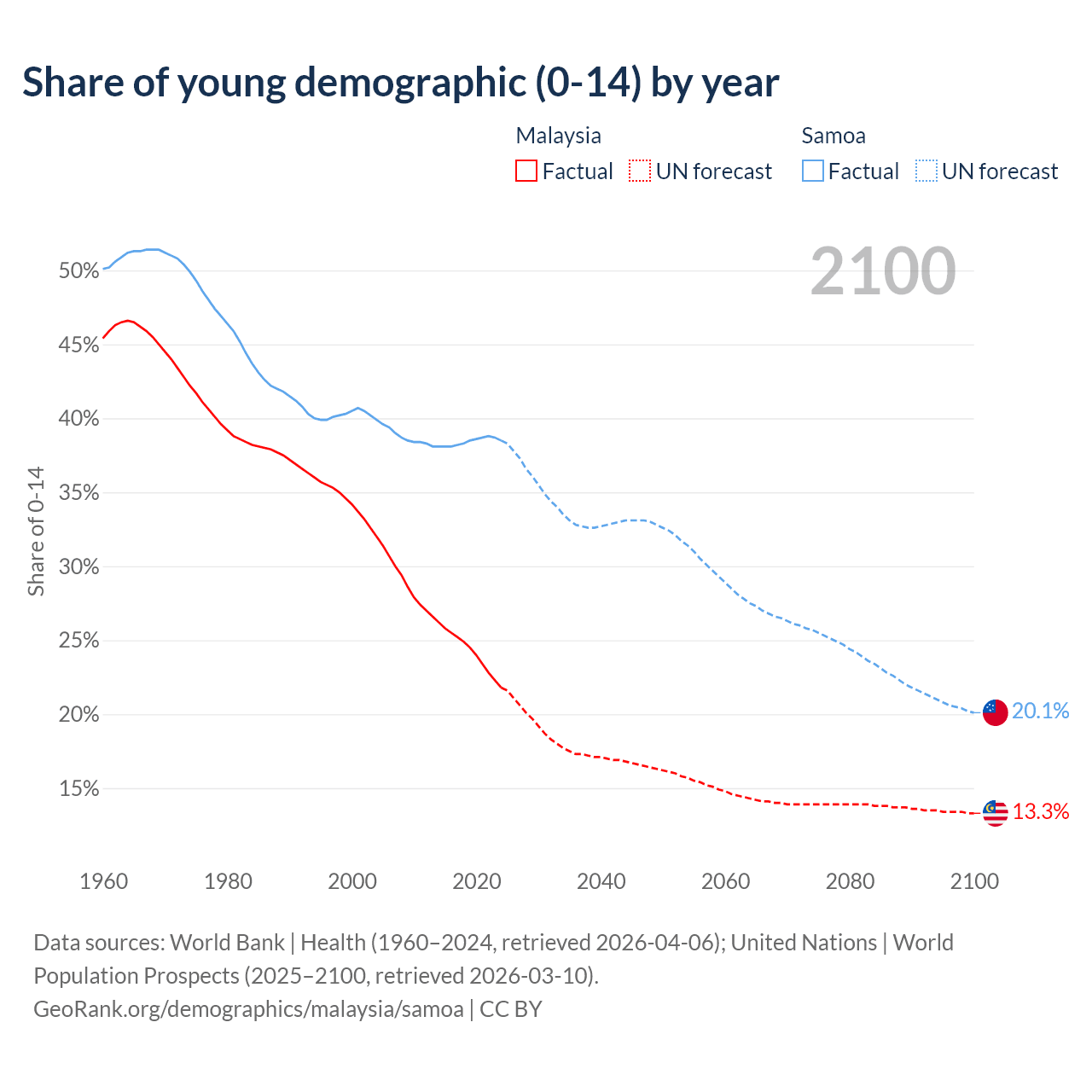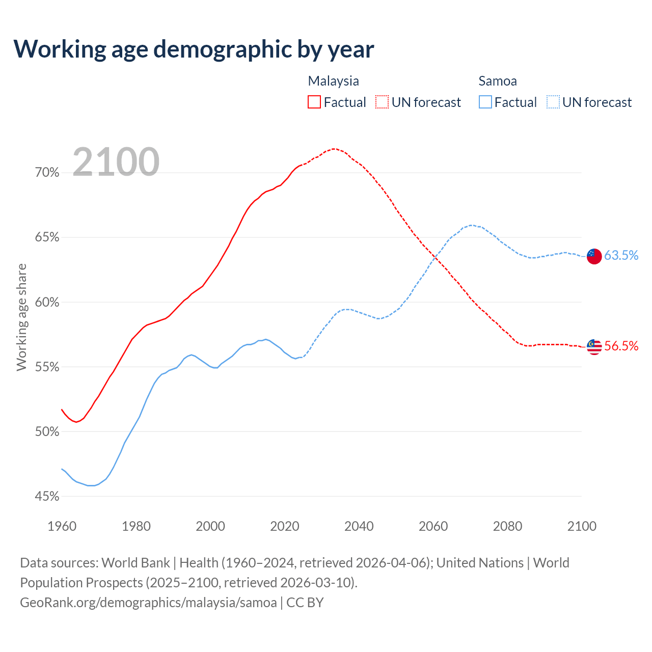 Median age Malaysia vs Samoa, 1960-2100