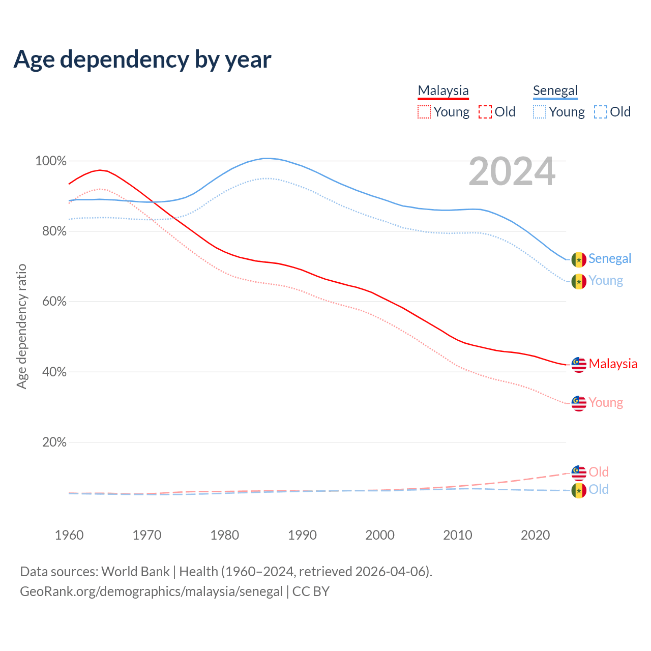 - Malaysia is ranked 92/196 by median age (oldest to youngest) vs 162/196 for Senegal.