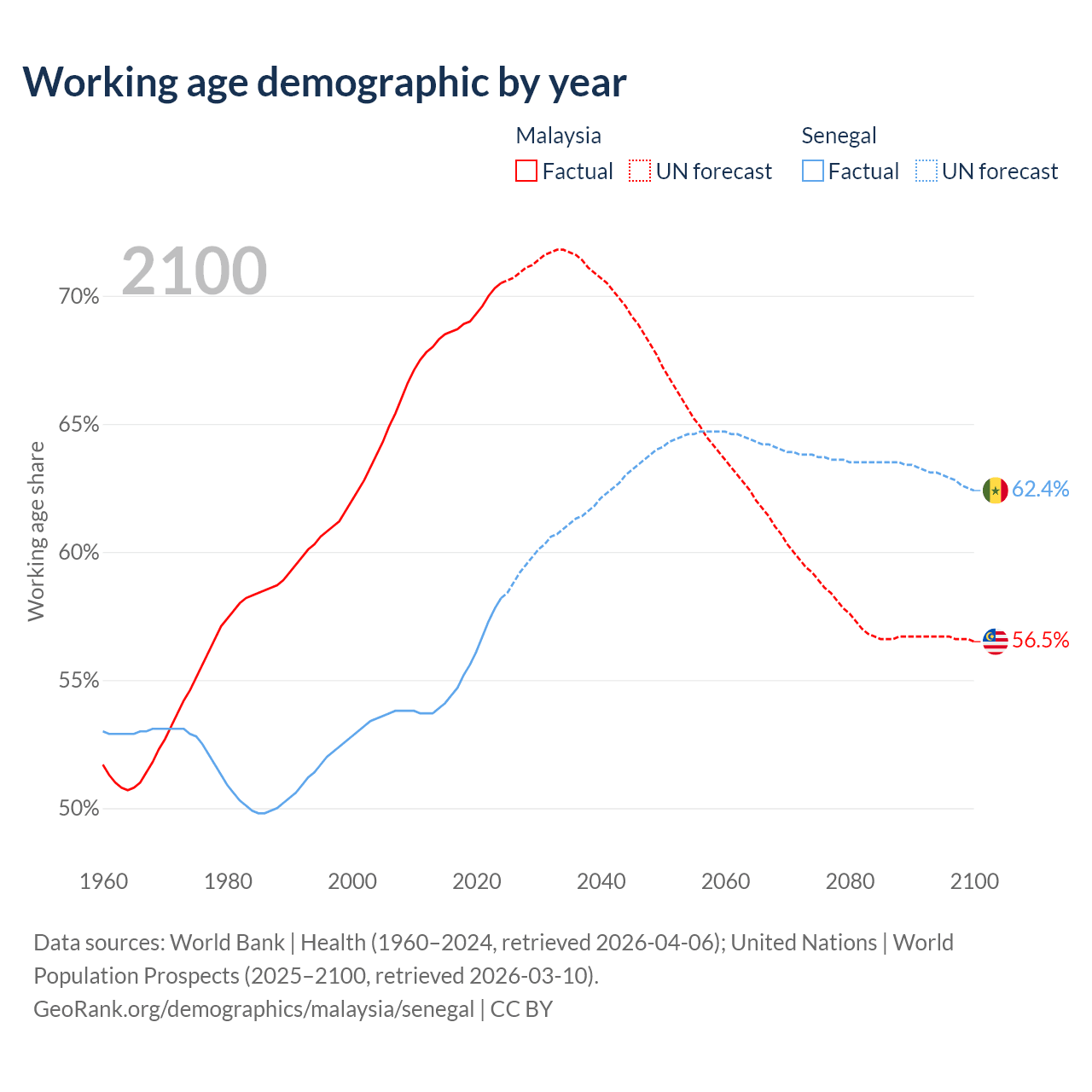- Malaysia has 25.7M working age adults (aged 15-64) vs 11.3M in Senegal.