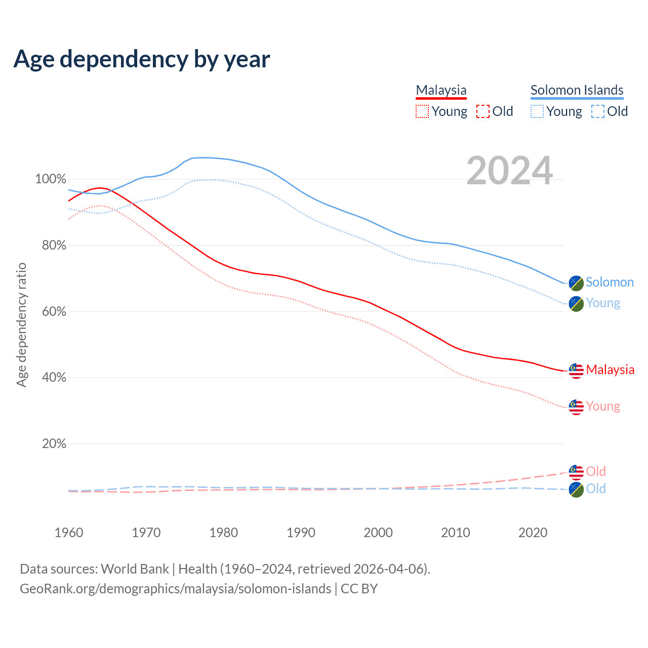- Malaysia is ranked 92/196 by median age (oldest to youngest) vs 153/196 for the Solomon Islands.
