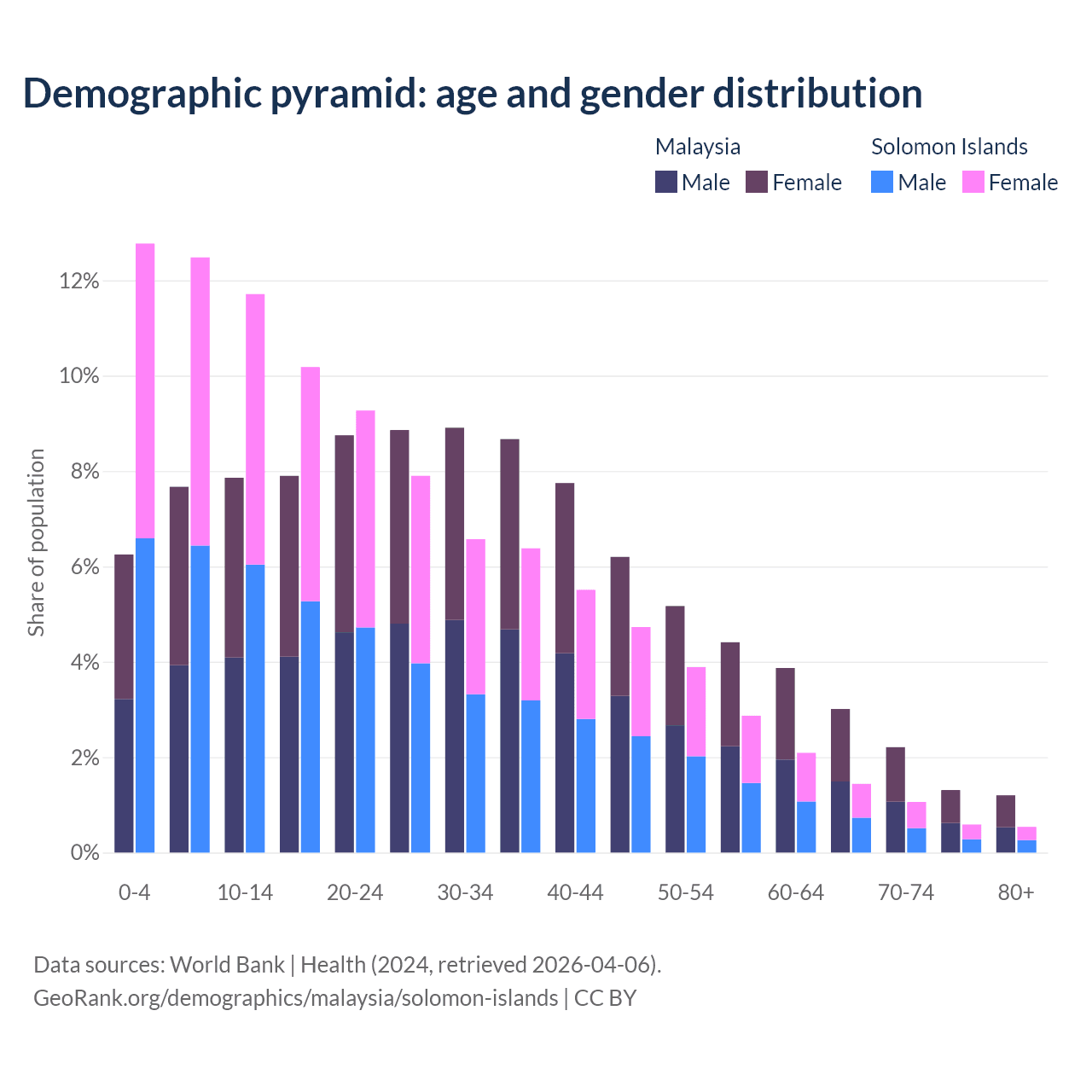 - As of 2026, the population of Malaysia is 36.5M vs 864K in the Solomon Islands - 42.3 times difference.