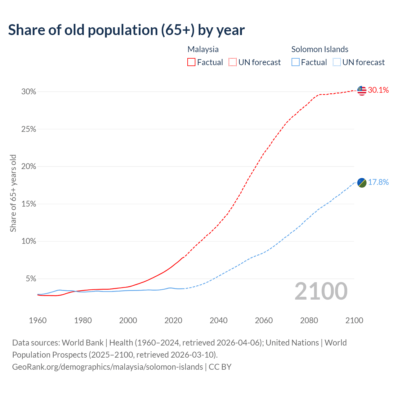 The share of older people aged 65 and over is 7.74% in Malaysia and 3.64% in the Solomon Islands. Life expectancy in Malaysia compared to the Solomon Islands .