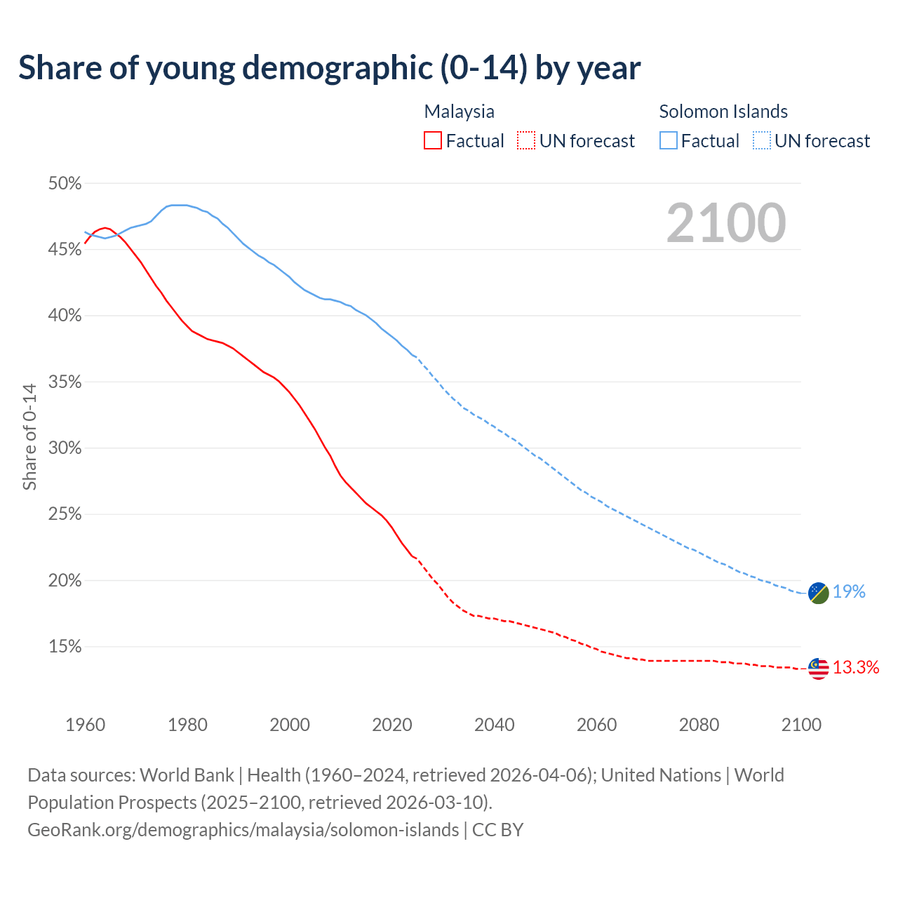 - The share of young demographic (0-15 years old) in Malaysia is 21.8% vs 37% in the Solomon Islands.