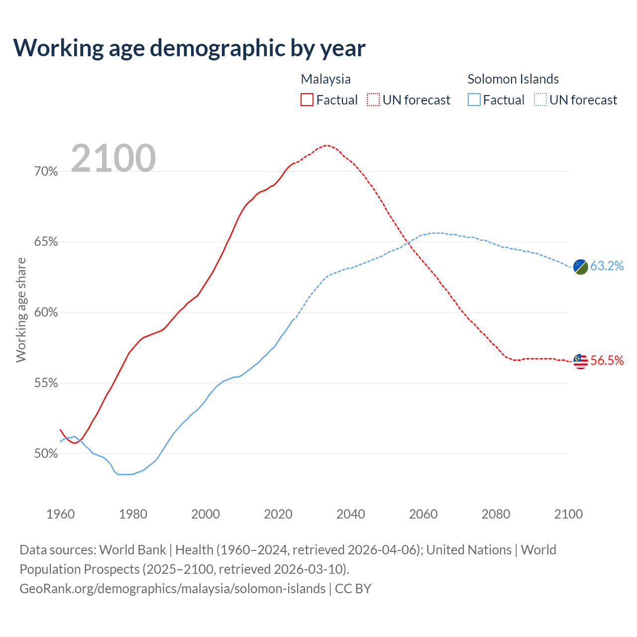 - Malaysia has 25.7M working age adults (aged 15-64) vs 513K in the Solomon Islands.