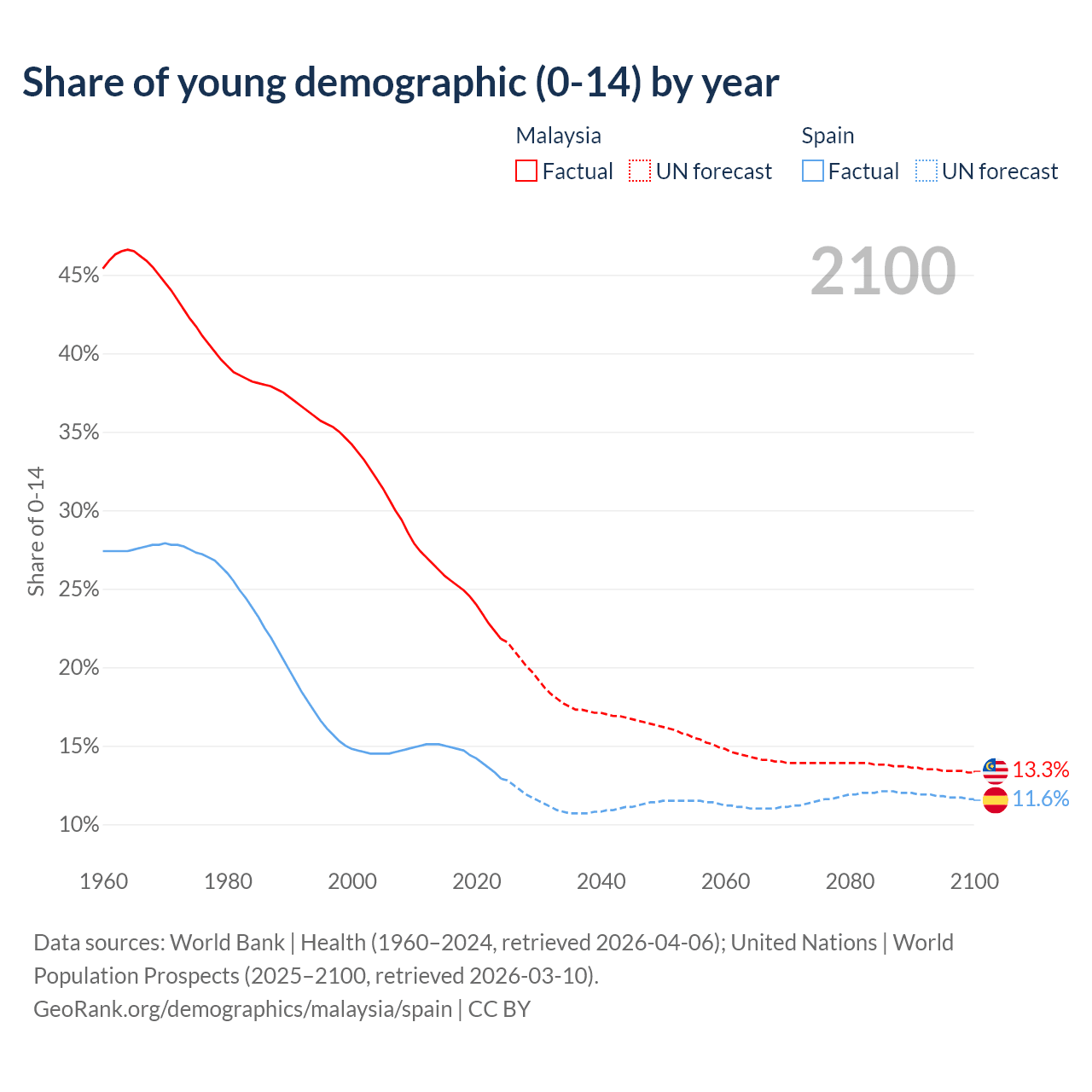 - The share of young demographic (0-15 years old) in Malaysia is 21.8% vs 12.9% in Spain.