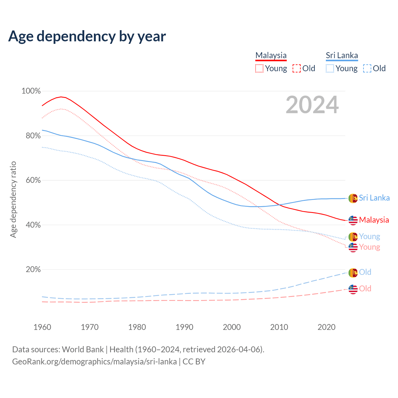 - Malaysia is ranked 92/196 by median age (oldest to youngest) vs 81/196 for Sri Lanka.