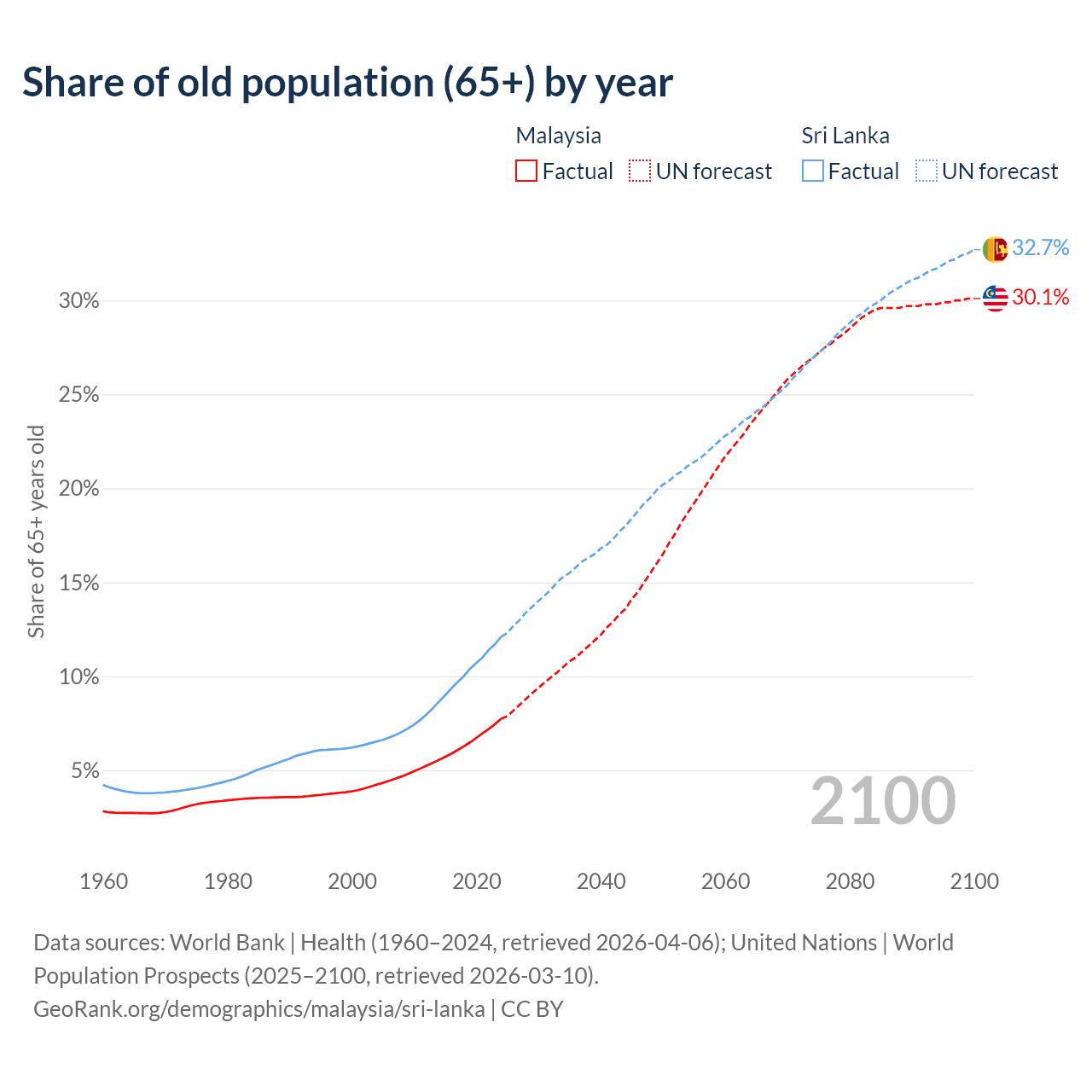 The share of older people aged 65 and over is 7.74% in Malaysia and 12.1% in Sri Lanka. Life expectancy in Malaysia compared to Sri Lanka .