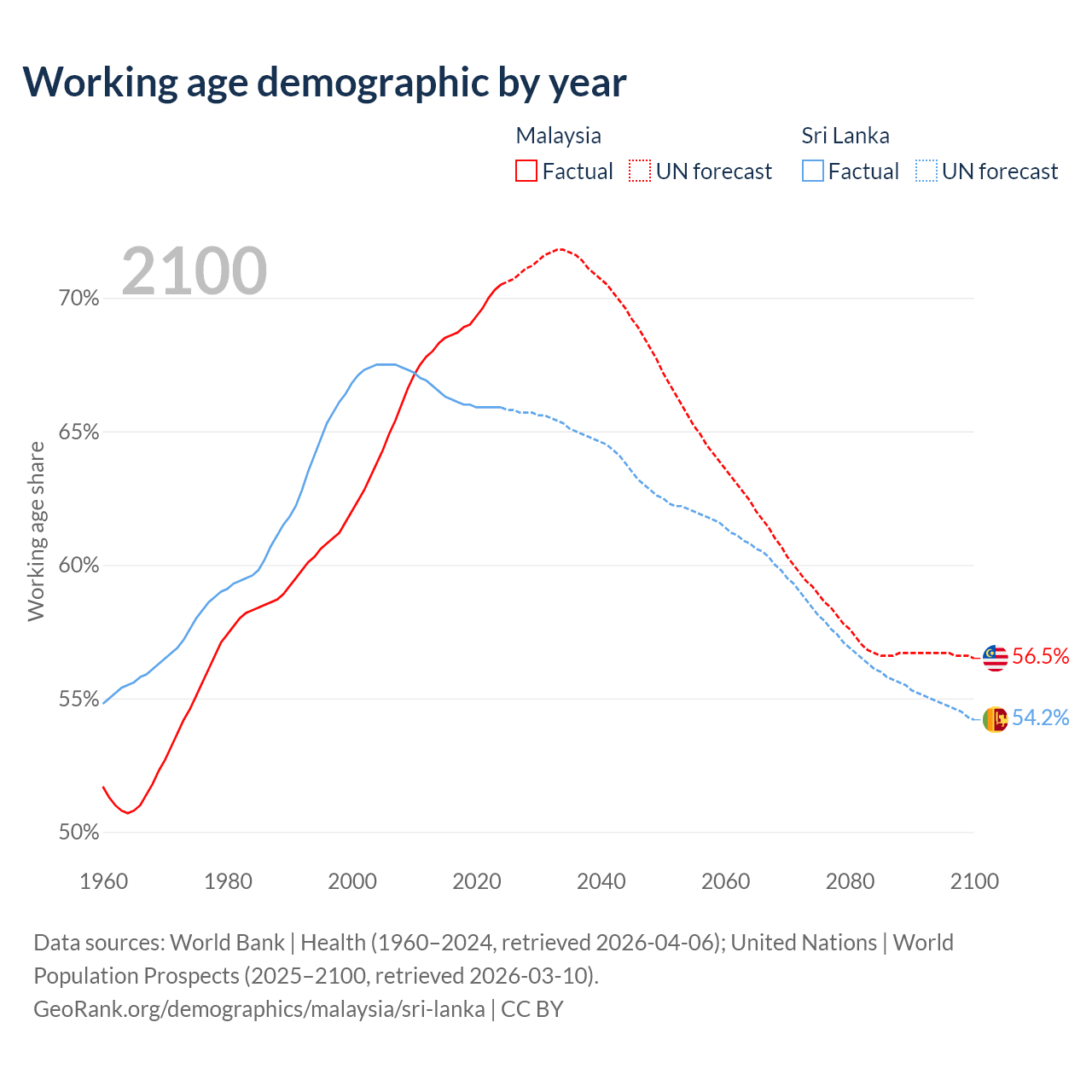 - Malaysia has 25.7M working age adults (aged 15-64) vs 14.6M in Sri Lanka.