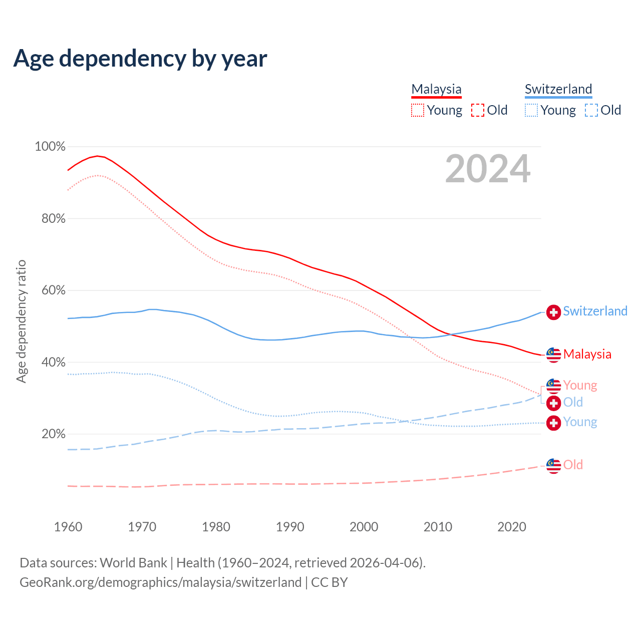 Data sources: World Bank | Health (1960–2024, retrieved 2026-04-06); U.S. Census Bureau (1960–2024, retrieved 2026-02-08).