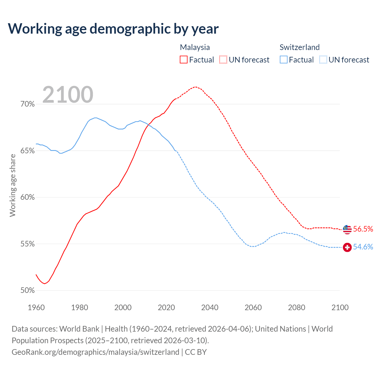 Median age Malaysia vs Switzerland, 1960-2100